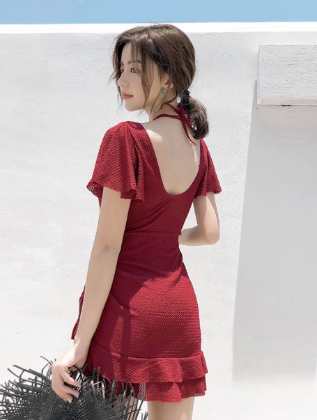 Vido's new spa with a swimsuit conservative wine red dress style cover with a slim and sexy holiday swimsuit