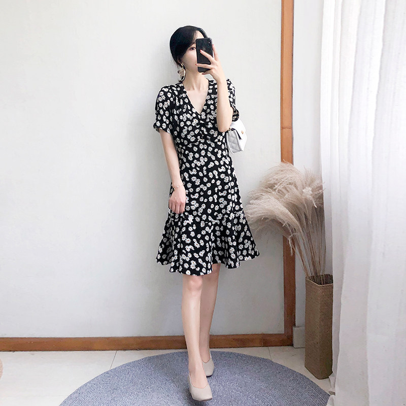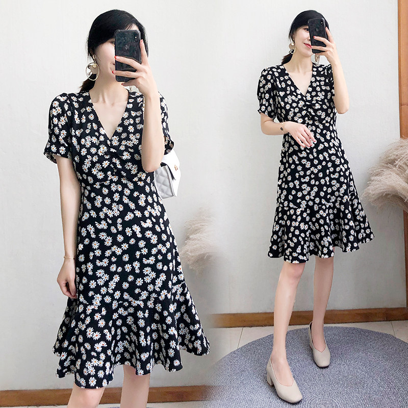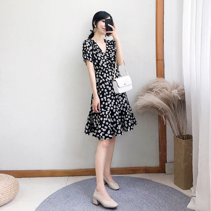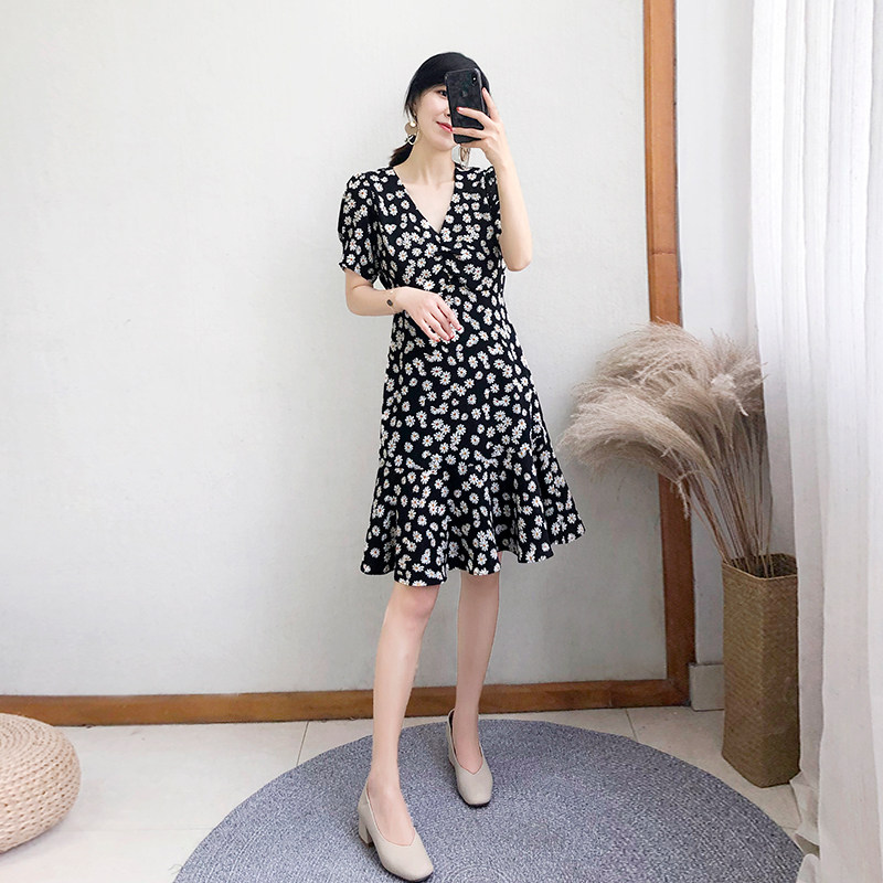 2023 new women's summer mid-length daisy dress female black high waist ruffled short-sleeved floral skirt