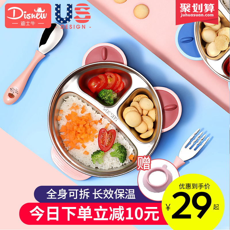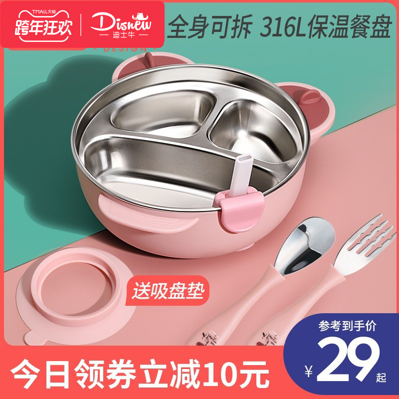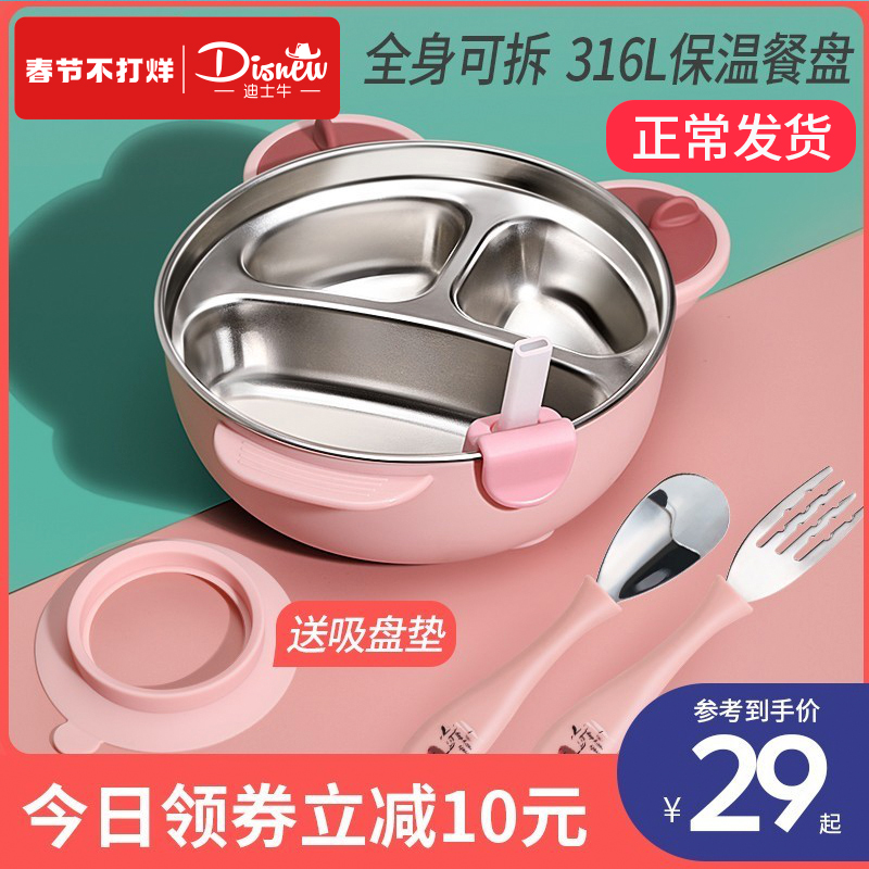 Baby dinner plate stainless steel compartment suction cup type eating cartoon water insulation bowl supplement baby children's tableware set