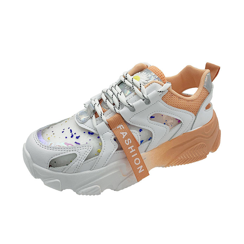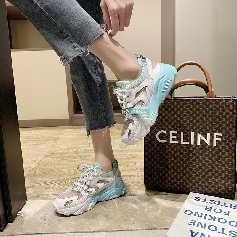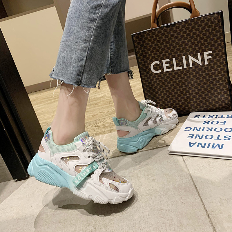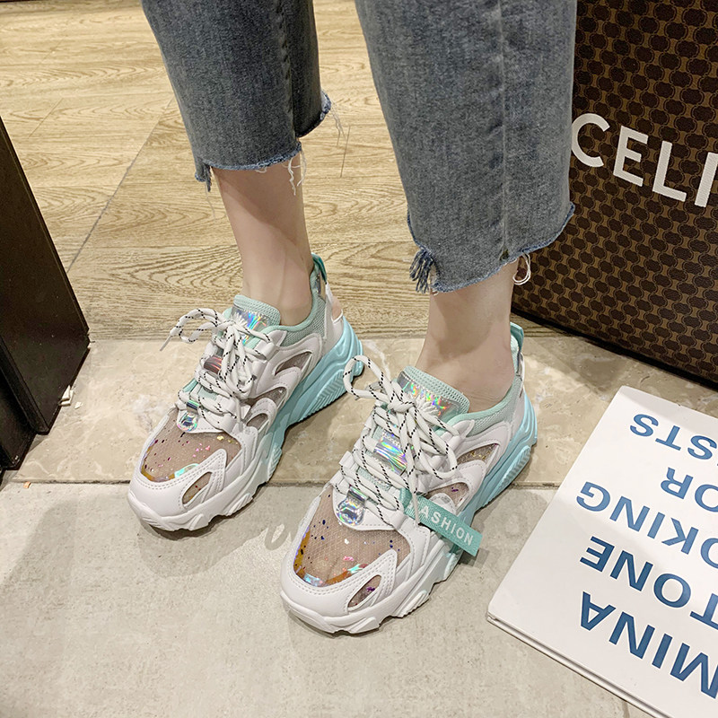 Tide Cards 2022 Autumn Boots High Heel Sneakers Women Breathable Bright Sheet Mesh Sneakers Thick Bottom 100 Hitch-Layer Color Old Daddy Shoes