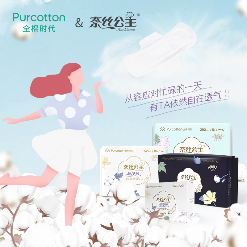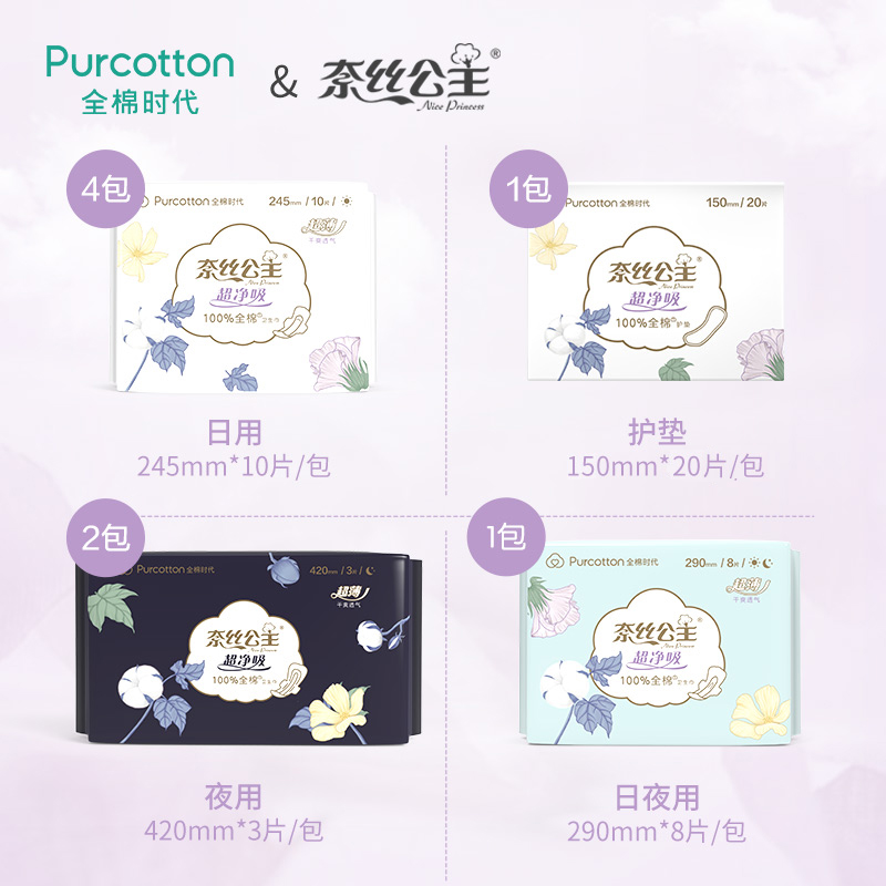 100% cotton era Ness Princess sanitary napkin day and night combination aunt towel 100% cotton surface ultra-thin cotton 74 pieces