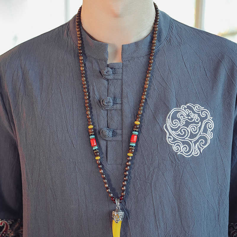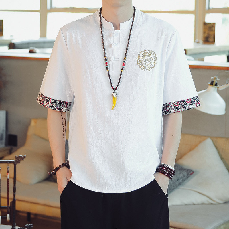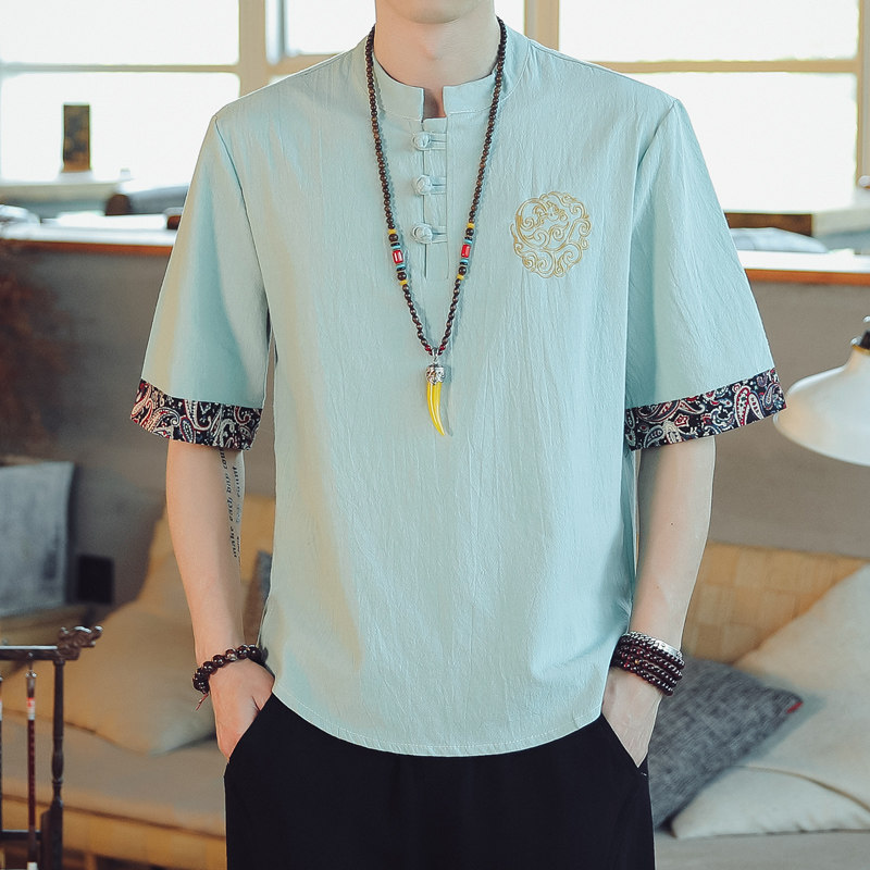 Linen short-sleeved t-shirt men's embroidery Chinese trend brand trend cotton and linen casual half-sleeved summer loose stand-up collar Tang suit