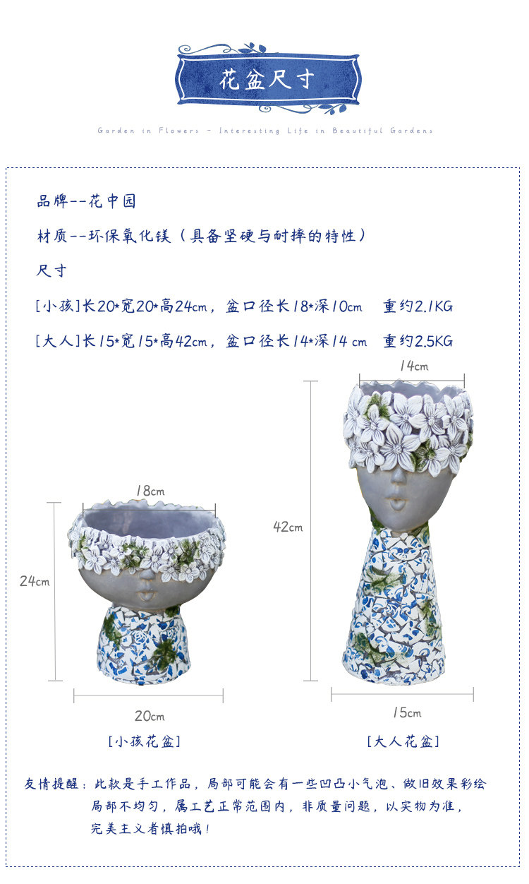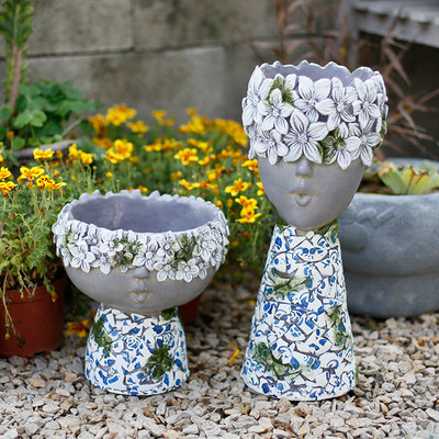 Flower pot balcony courtyard decoration Blue and white porcelain Chinese style cartoon portrait cute creative garden terrace decoration decoration