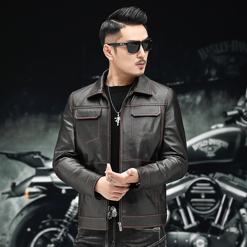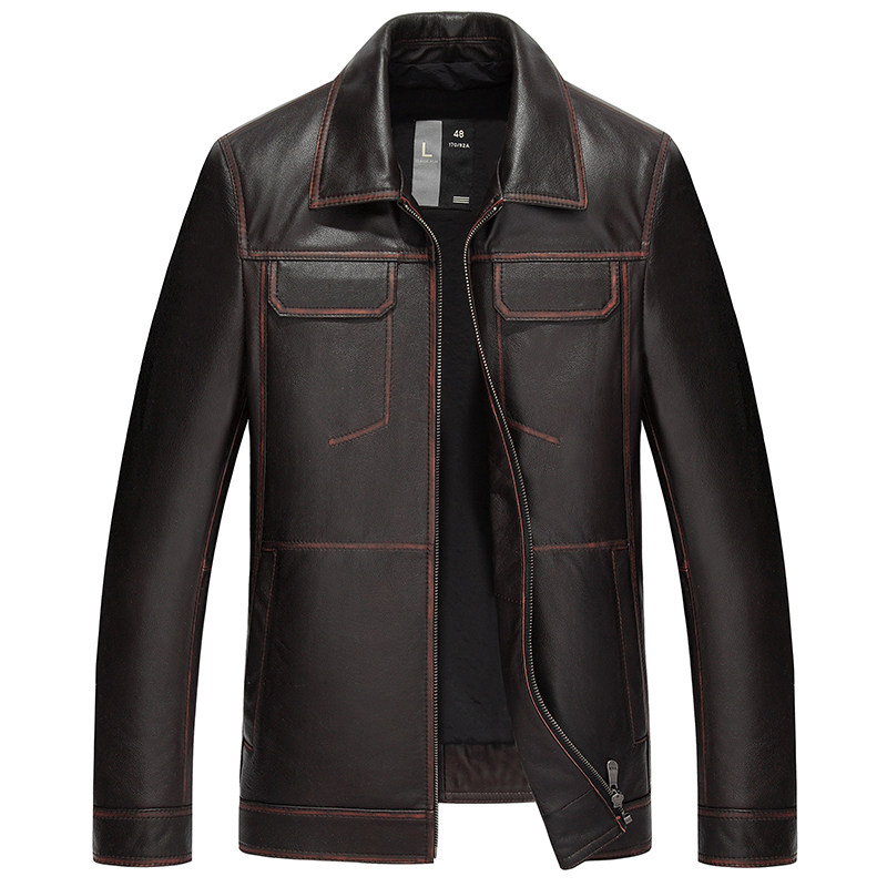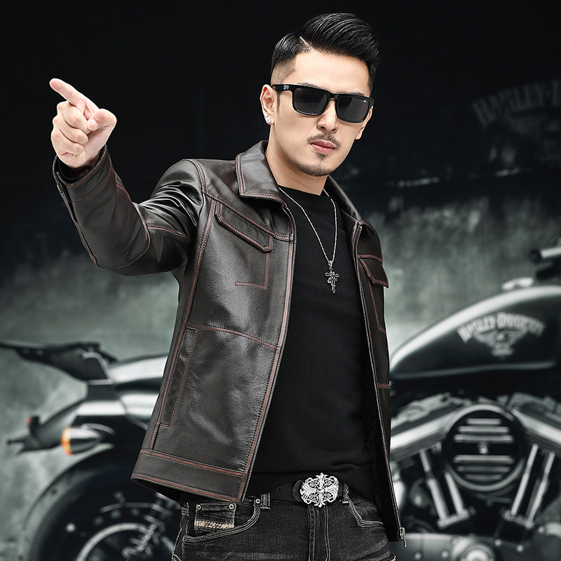 Cowhide leather jacket male leather jacket short lapel retro do old youth motorcycle clothing leather jacket thin coat trend