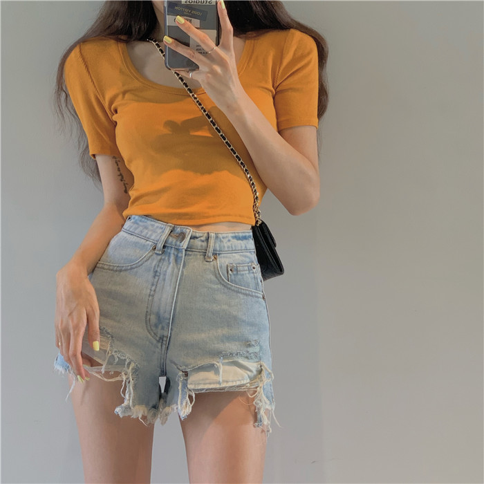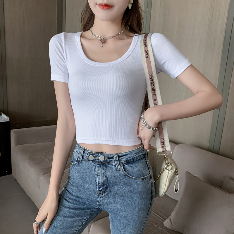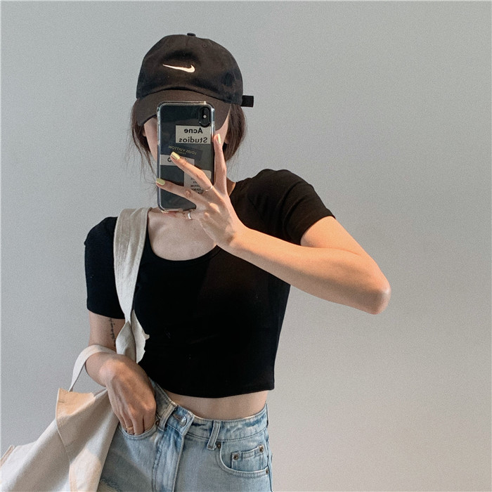 2021 Summer lo collarbone tight careful machine top low collar High waist short leakage navel large U collar chest T-shirt women