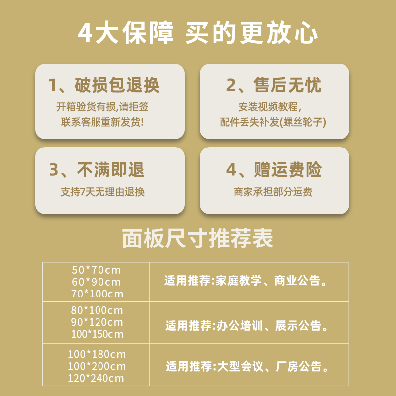 (Economy) 50*70 double-sided whiteboard bracket + 10 pen 12 magnetic particles 1 plate erase (economy model) 60 *90 single-sided whiteboard + white bracket + 10 pen 12 magnetic particles 1 plate erase (classic model) 60 *90 single-sided black frame whiteboard bracket + 10 pen 12 magnetic particles 1 plate erase (quality model) 60 * 90 double-sided whiteboard bracket + 10 pen 12 magnetic particles 1 plate erase (quality model) 60 * 90 double-sided white green board bracket + 10 pen 12 magnetic particle 2 plate rubbing 12 chalk pen (quality model) 70 * 100 double-sided silver frame whiteboard bracket + 10 pen 12 magnetic particle 1 plate erase (economy model) 80 *100 single-sided whiteboard bracket + 10 pen 12 magnetic particle 1 plate wipe (classic model) 80 *100 single-sided black frame whiteboard bracket + 10 pen 12 magnetic particle 1 plate erase (classic model) 80 *100 double-sided black frame whiteboard bracket + 10 pen 12 magnetic particle 1 plate erase (quality model) 80 *10 pen 12 magnetic particle 1 plate rubbing (quality model) 80 *100 double-sided white and green board bracket + 10 pen 12 magnetic particle 2 plate rubbing 12 chalk pen (economy model) 90* 120 single-sided whiteboard bracket + 10 pen 12 magnetic particles 1 plate erase (classic model) 90 *120 single-sided black frame whiteboard bracket + 10 pen 12 magnetic particles 1 plate erase (classic model) 90 *120 double-sided black frame whiteboard bracket + 10 pen 12 magnetic particles 1 plate rubbing (quality model) 90 * 12 magnetic particles 1 plate wipe (quality model) 90 * 120 double-sided white green plate bracket + 10 pen 12 magnetic particles 2 plate rubbing 12 chalk pen (thickened version) 90 * 120 double-sided whiteboard thickened solid frame + 10 pen 12 magnetic particles 1 plate erase (economy) 90 *150 single-sided whiteboard bracket + 10 pen 12 magnetic particles 1 plate erase (quality model) 90 *150 double-sided whiteboard bracket + 10 pen 12 magnetic particles 1 plate erase (classic model) 90 *150 double-sided black frame whiteboard black board black bracket + 10 pen 12 magnetic particles 1 plate erase (economy model) 100 * 150 single-sided whiteboard bracket + 10 pen 12 magnetic particles 1 plate rubbing (quality model) 100* 150 double-sided whiteboard bracket + 10 pen 12 magnetic particles 1 plate erase (classic) 100 *150 double-sided black frame white board bracket + 10 pen 12 magnetic particles 1 plate erase