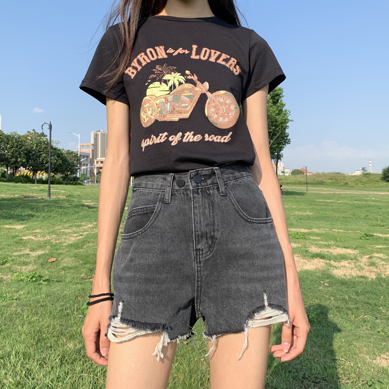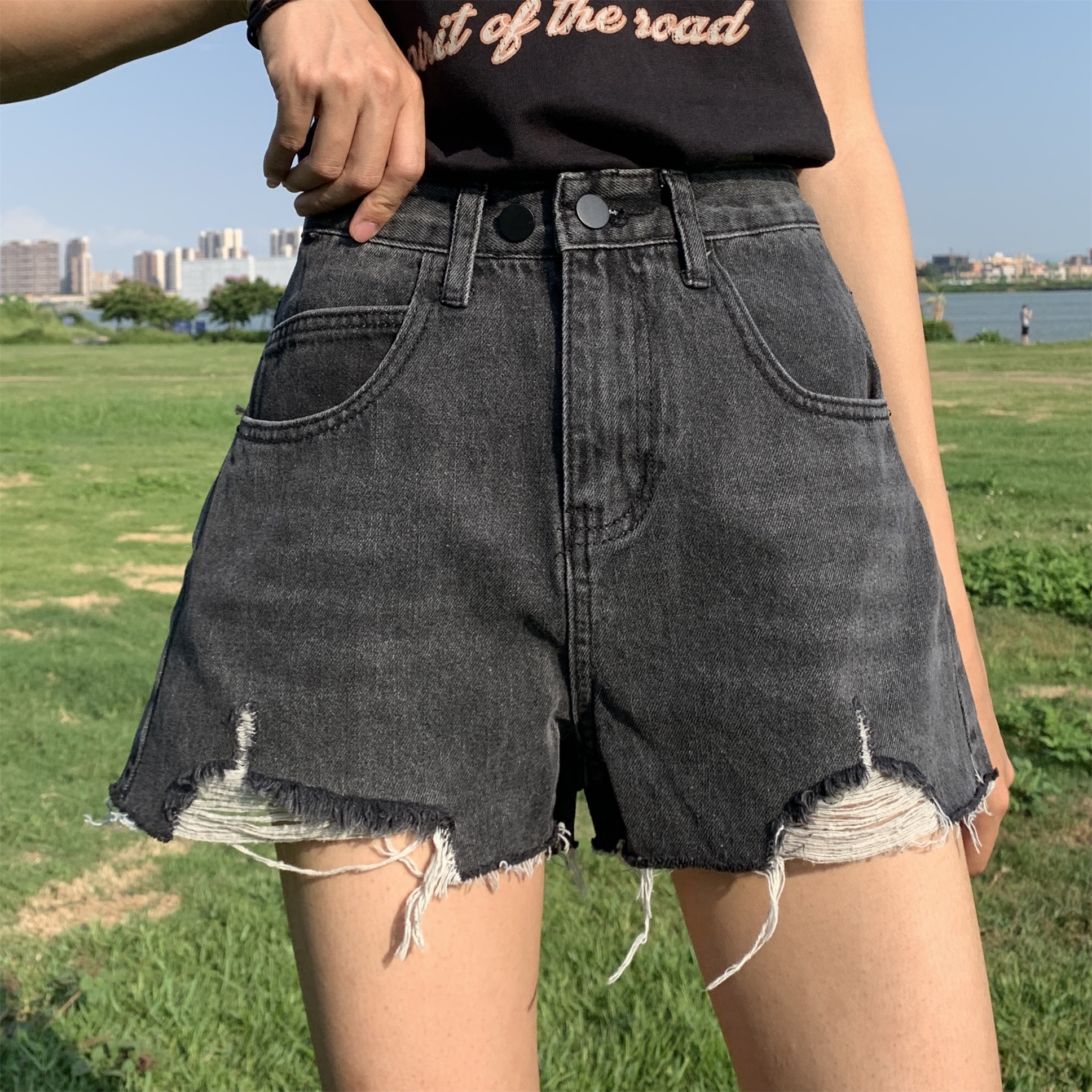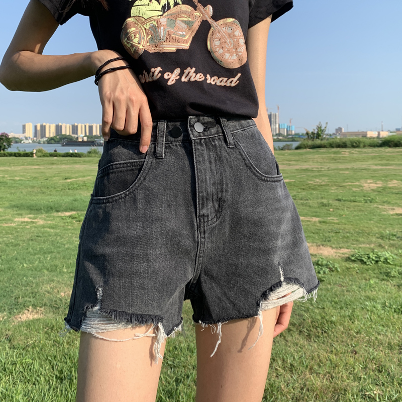 Smoke gray high waist a word denim shorts women's summer thin section hole loose thin large size fat MM hot pants tide