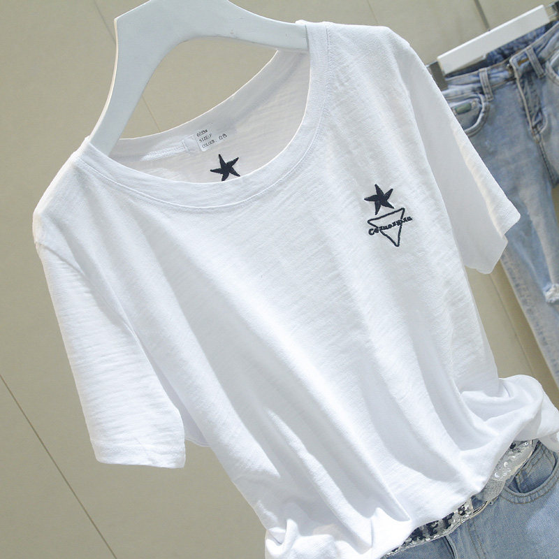 South Korea Short Sleeve T-shirt Woman 2022 Summer Embroidery Pentagram Half Sleeve Bamboo Festival Cotton T-shirt Student Loose Blouses