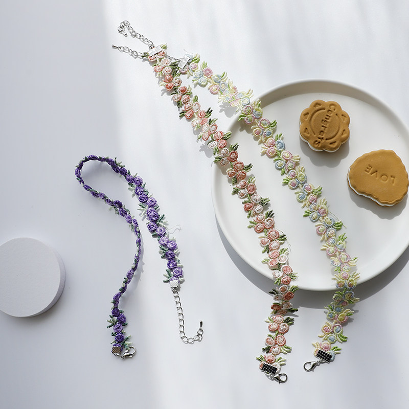 Pink cherry florets (shoulder strap) Yellow cherry florets (shoulder straps) Light purple small flowers (shoulder straps) Dark purple small flowers (shoulder straps) Pink cherry florets (shoulder straps + necklace 1 set) Yellow cherry florets (shoulder straps + necklace 1 set) Light purple small flowers (shoulder straps + choker 1 set) Dark purple small flowers (shoulder straps + chokers 1 set) Pink cherry florets Necklace 1 yellow cherry floret Necklace 1 light purple small flowers Necklace 1 dark purple small flowers Neck chain 1 necklace