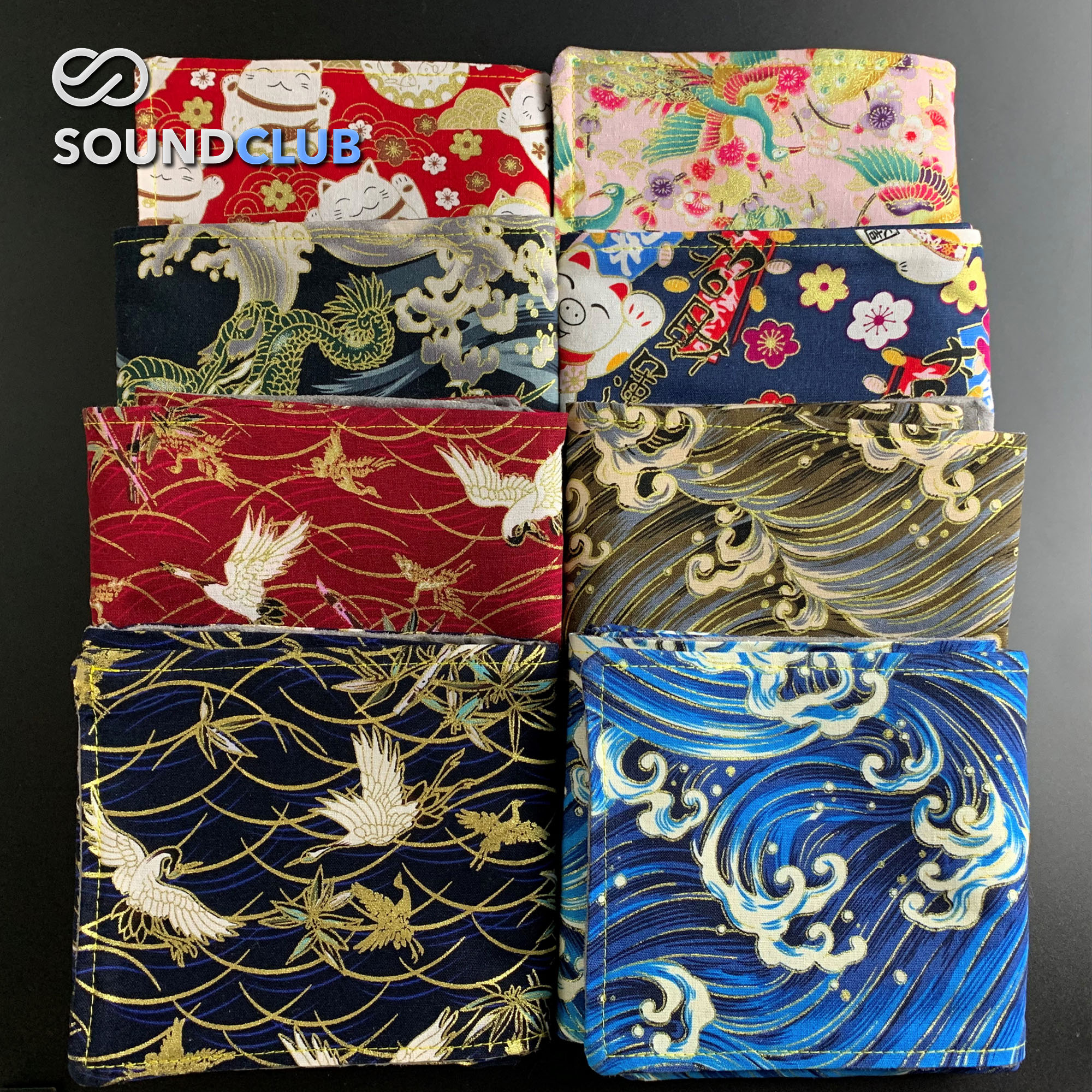 Majestic waves (blue) Phnom Penh White Crane (black background) Yuanqi Piglet (Navy background) Phnom Penh White Crane (crimson background) Majestic Waves (Brown) Golden Lin Waves (black background) Peacock Flying South (pink background) Fortune Fairy Cat (red background)