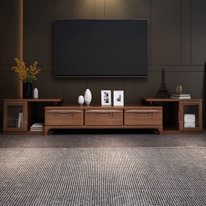 New Chinese Golden Silk Hupeach Wood Solid Wood TV Cabinet Retractable Wall Cabinet Tea Table Combination Modern Chinese Living Room Ground Cabinet