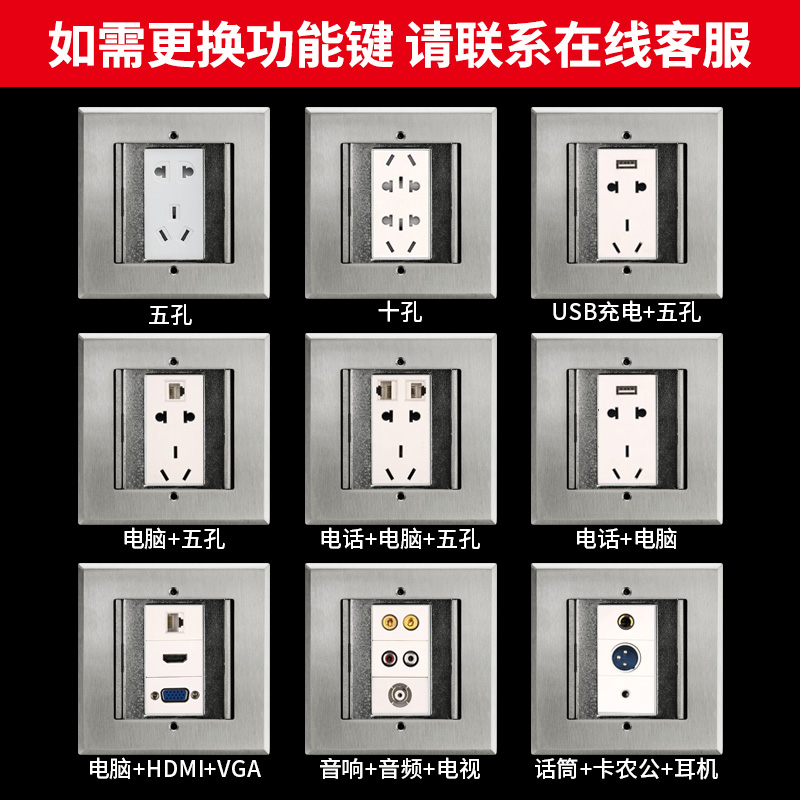 Five-hole Dual five-hole Ten-hole 16A Five-hole Five-hole with network Dual network Dual network Telephone Network Telephone 3 networks HDMI VGA Network HDMI