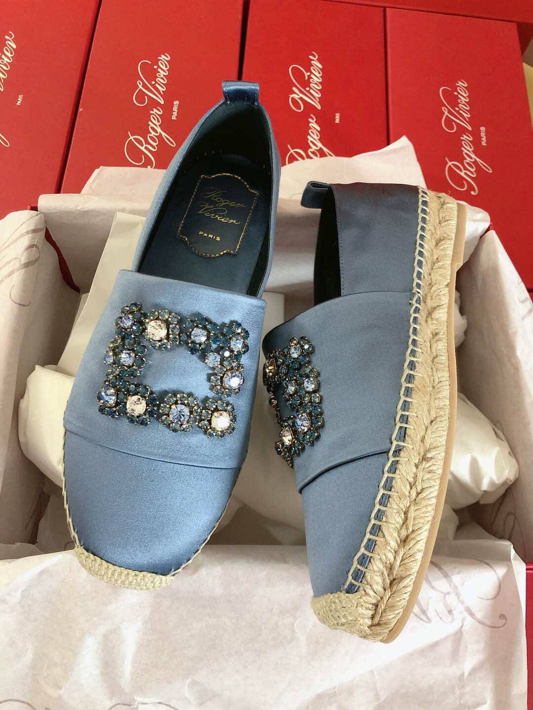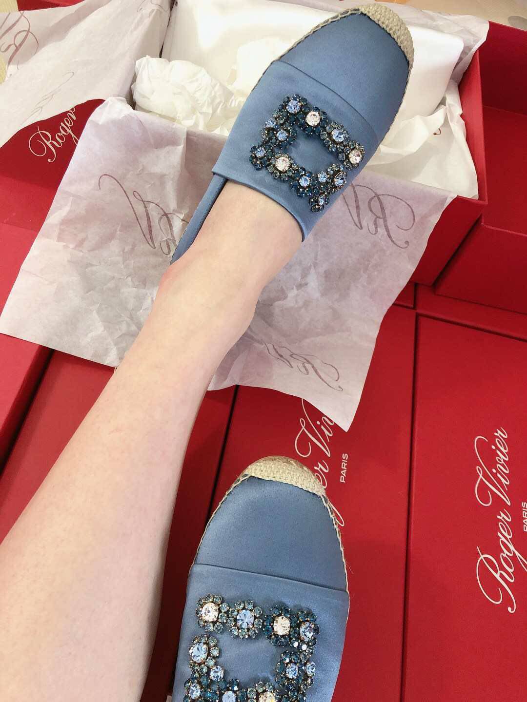 Roger vivier domestic spot spring round head baby blue flower diamond flat bottom satin fisherman shoes