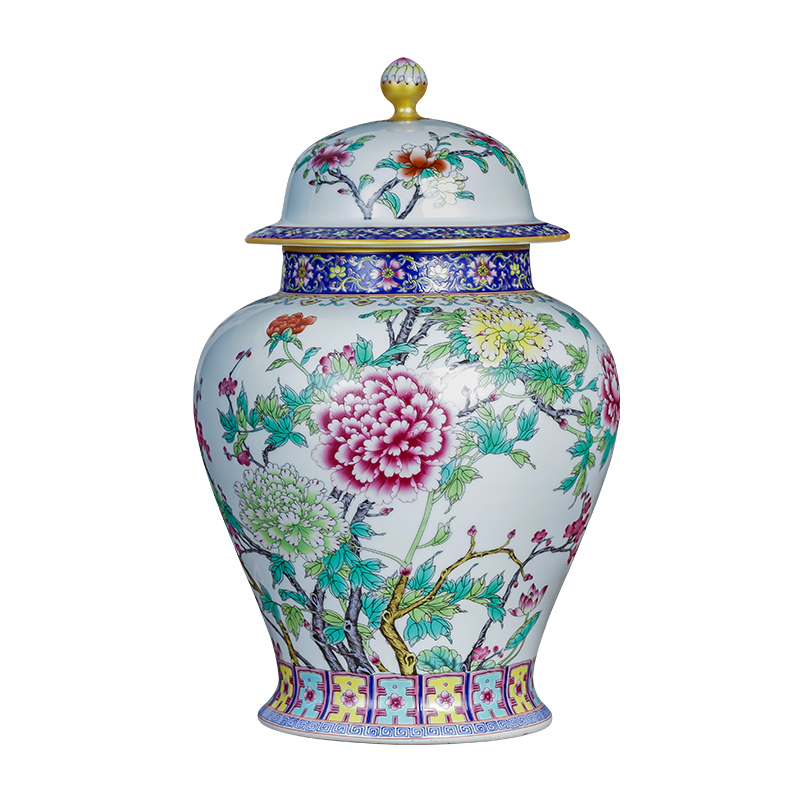 Imitate Qing Qianlong enamel enamel general peony jar + send rotary wooden base