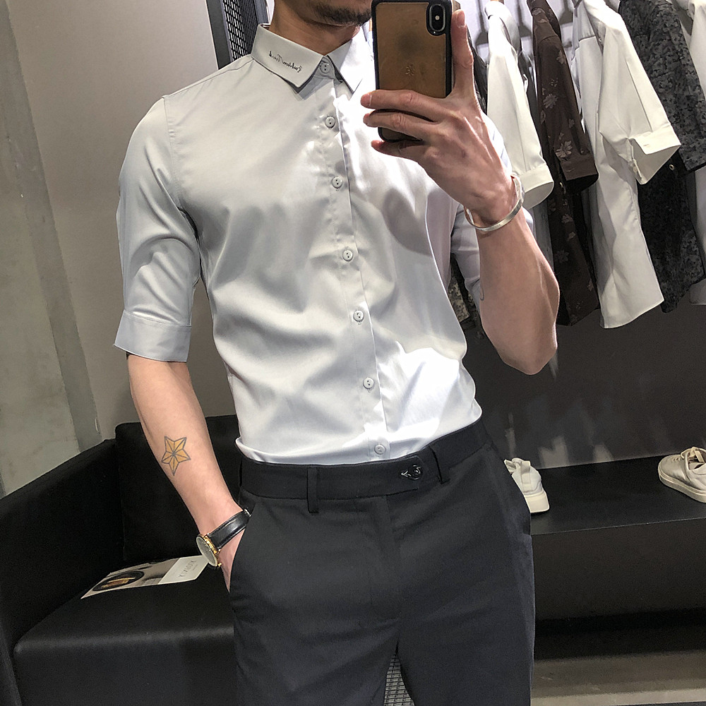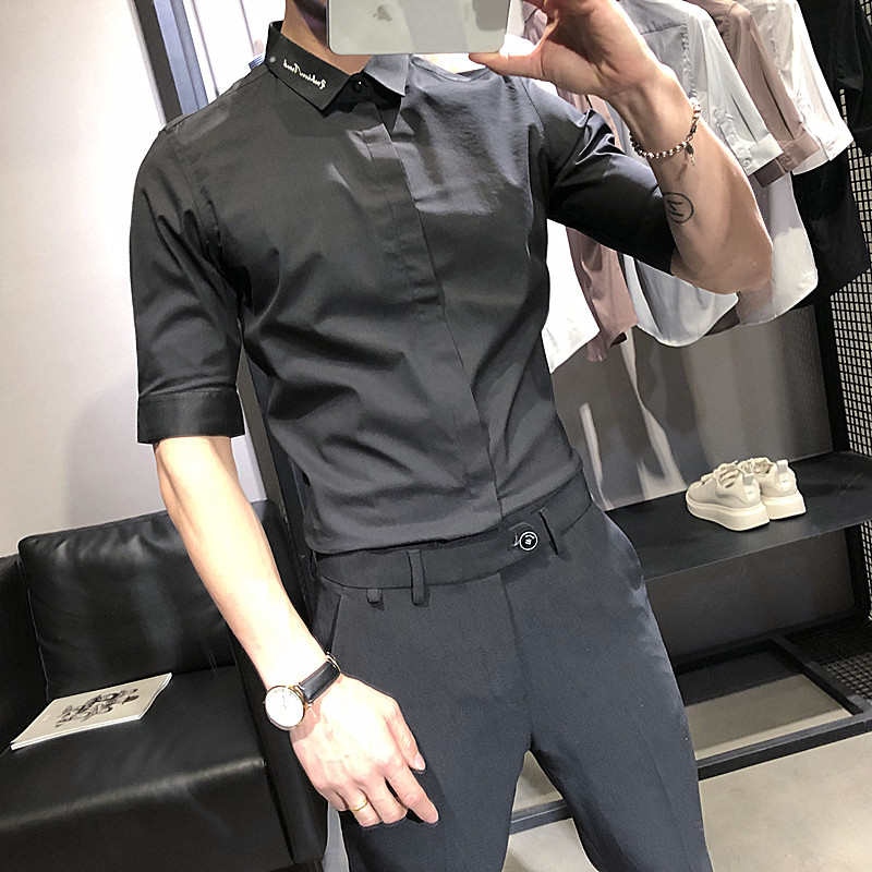 Shirt man short sleeve Korean version Body Trend 50% Sleeve Blouse blouse Embroidered Casual Handsome 100 lap men's shirt