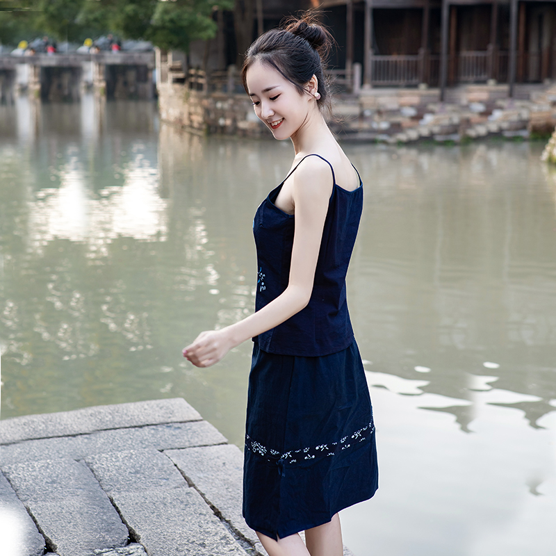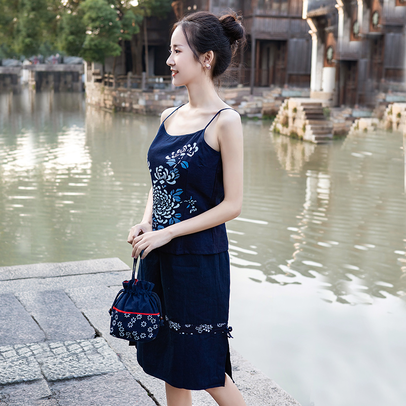 Uzhen National Wind Characteristics Blue Printed Cloth Women's Dress Pure Cotton Positioning Printed Sleeveless Vest Orchid Small Harness Suit
