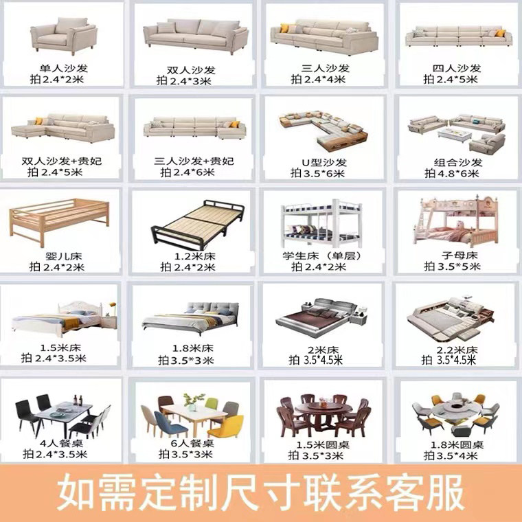 1 2*1m bedside table, small TV, etc. 1 2*2m coffee table, large TV, etc. 2 4*1m long TV cabinet, desk, etc. 2 4*2m student bed single sofa