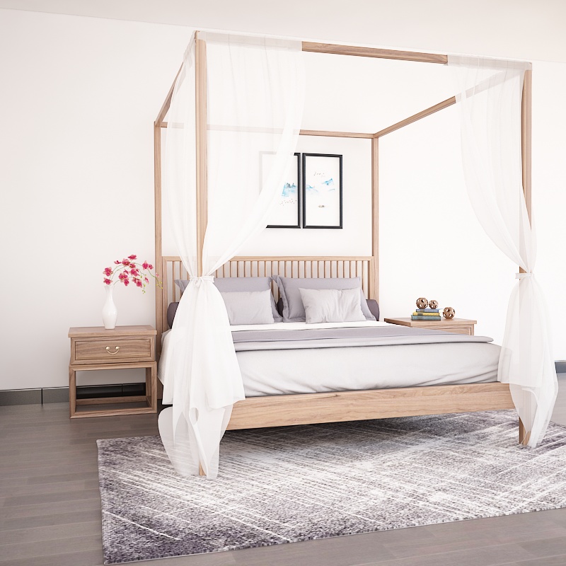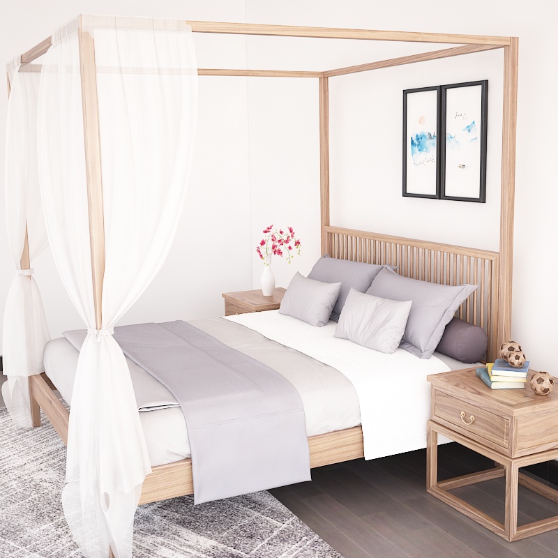 New Chinese master bedroom 1 8 m double bed minimalist old elm wood furniture four columns pure solid wood large bed luxury shelf bed-Taobao