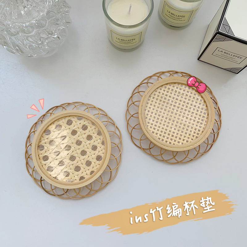 Ins Korean blogger with the same rattan weaving bamboo lace heat insulation coaster chic photo props jewelry storage small plate - Taobao