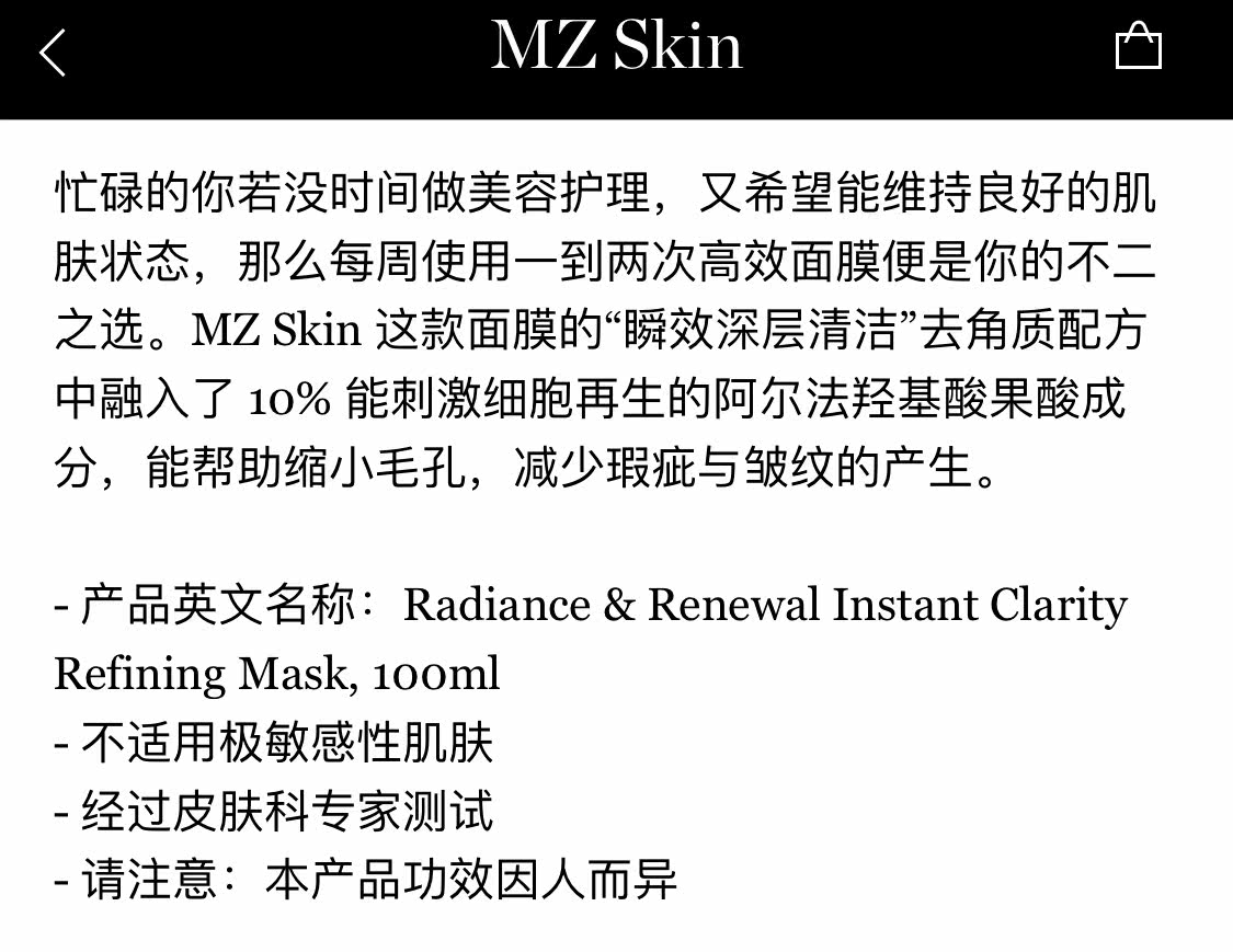 British MZ SKIN radiant rejuvenation instant deep cleansing mask 10% AHA fruit acid rejuvenating mask 100