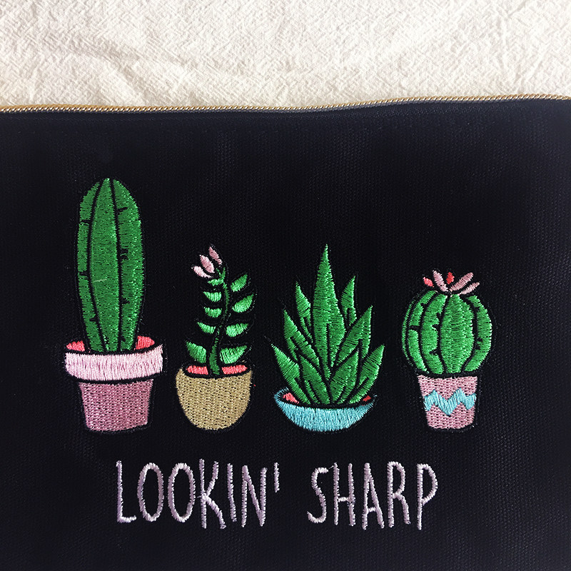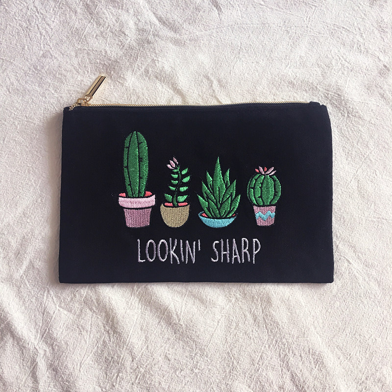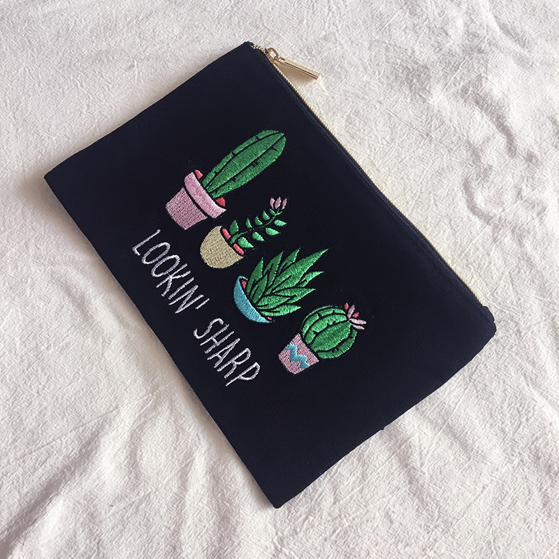INS F* ever21 original D classic black cactus potted embroidery portable canvas hand hold containing makeup bag