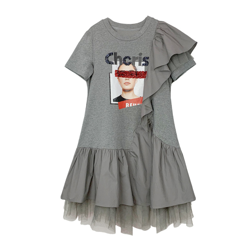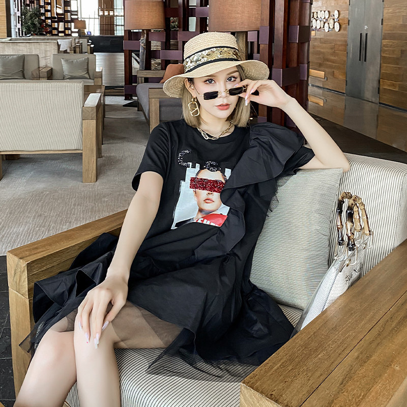 Dress women's 2020 new summer European station heavy hot diamond loose ruffle mesh stitching t-shirt skirt tide