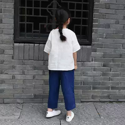 Cotton linen summer clothes new male and female children's T-shirt Chinese round neck literature and art fan buckle short sleeve cotton coat children's T-shirt