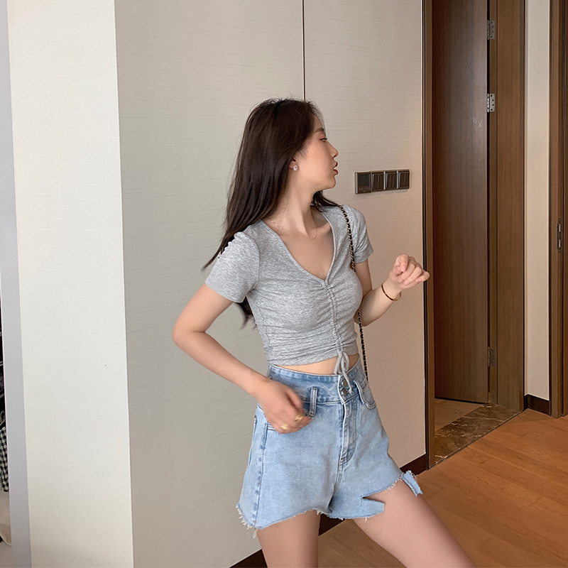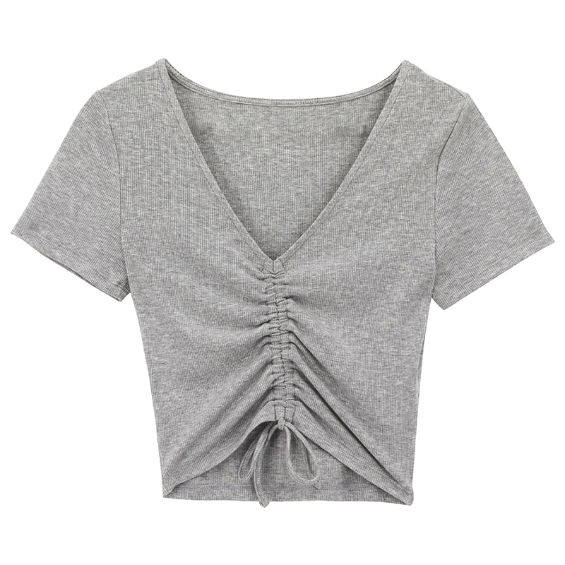 Black short-sleeved T-shirt women's 2022 new summer short V-neck top Korean version inner bottoming shirt drawstring T-shirt