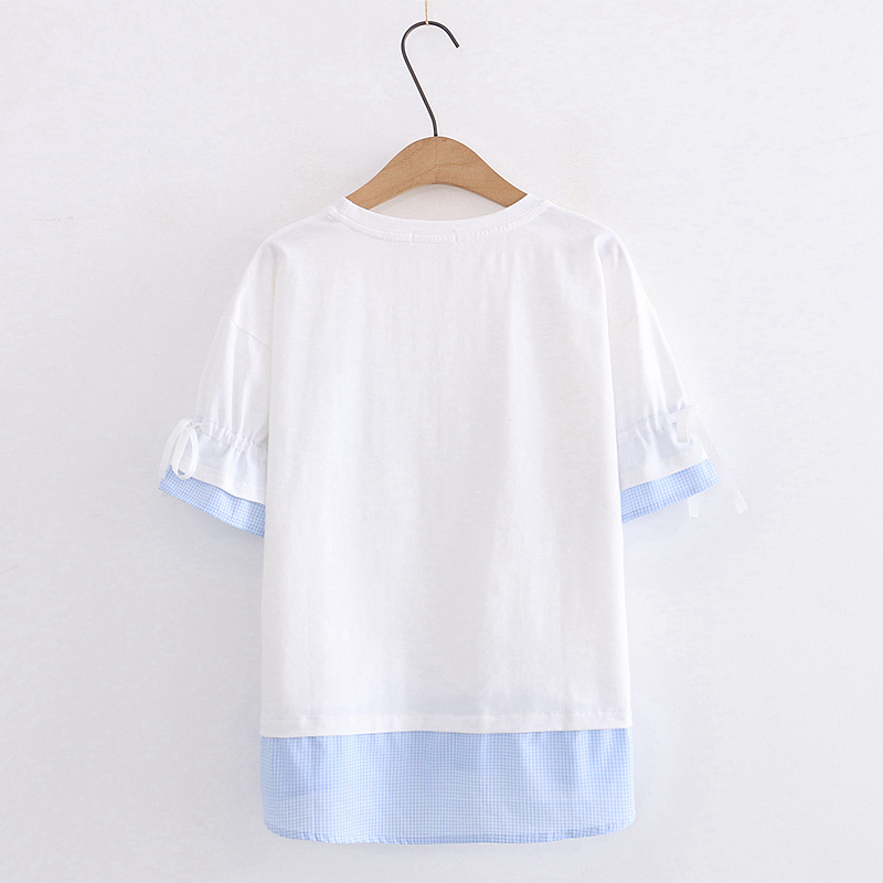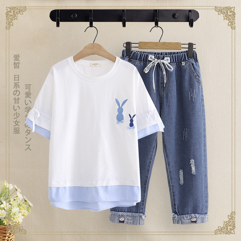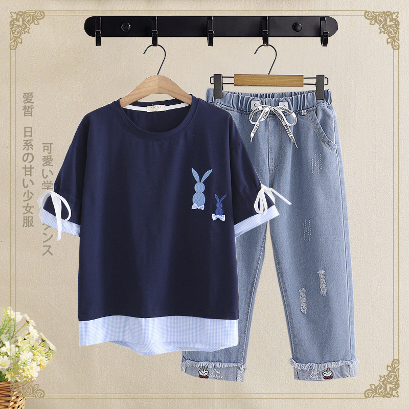 Summer middle school students pure cotton short-sleeved T two-piece middle school students loose casual suit Japanese Korean version 7 points jeans - Taobao
