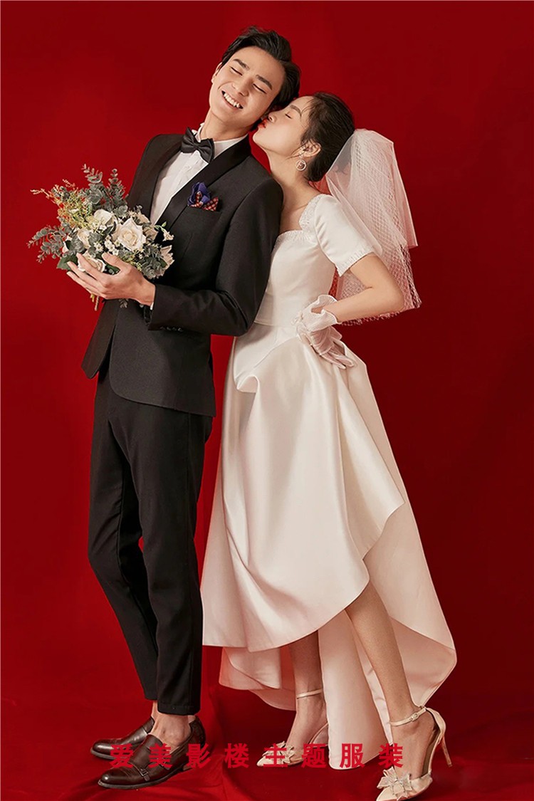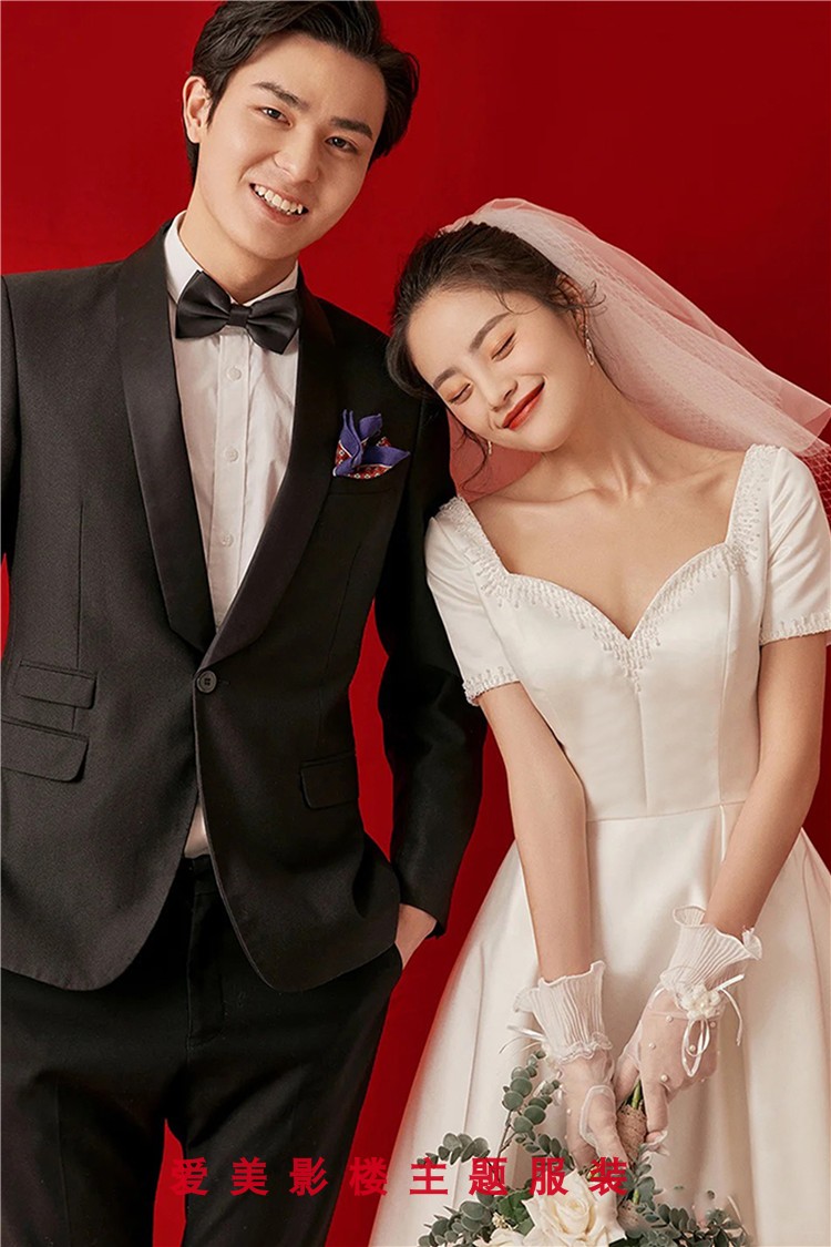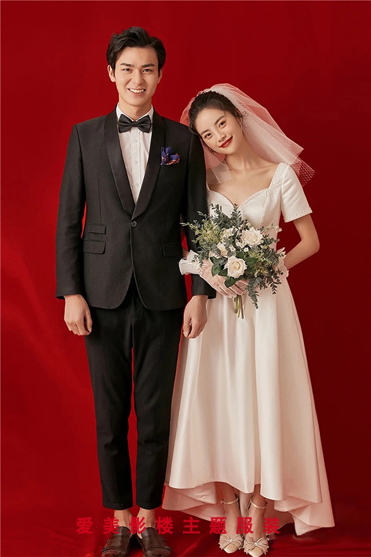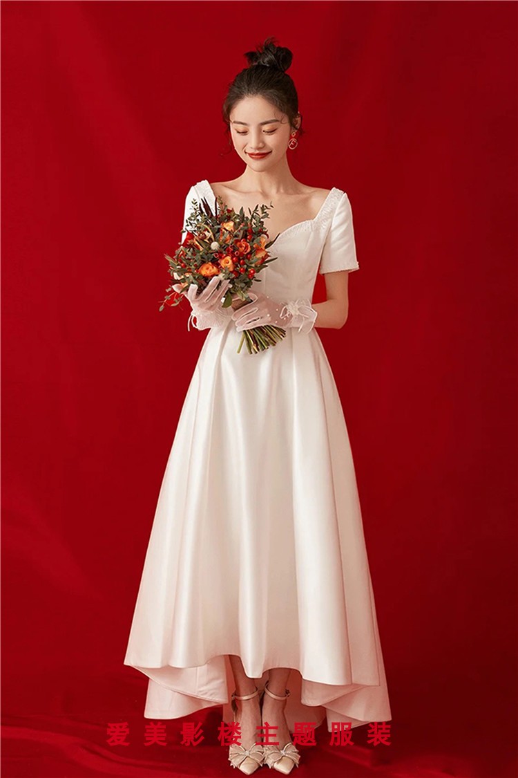 Retro light wedding dress French simple and thin 2022 photo studio theme clothing Korean short-sleeved satin banquet dress