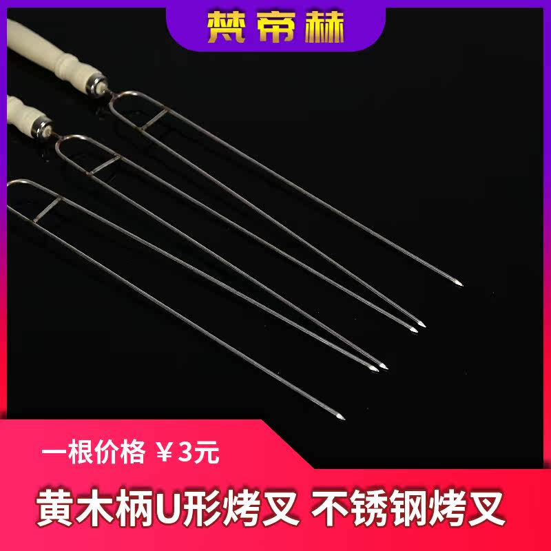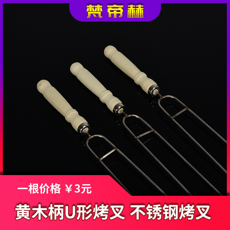 Yellow Wood Handle U Shaped Grilled Fork Chicken Wings Stainless Steel Barbecue Sign Grilled Meat Baking Needle