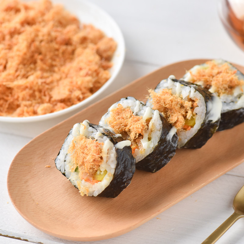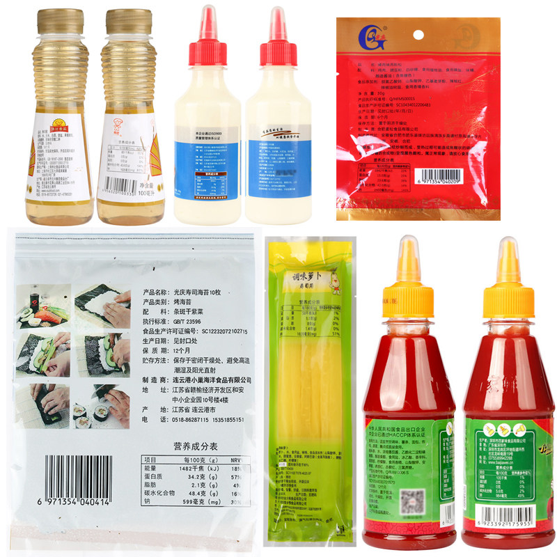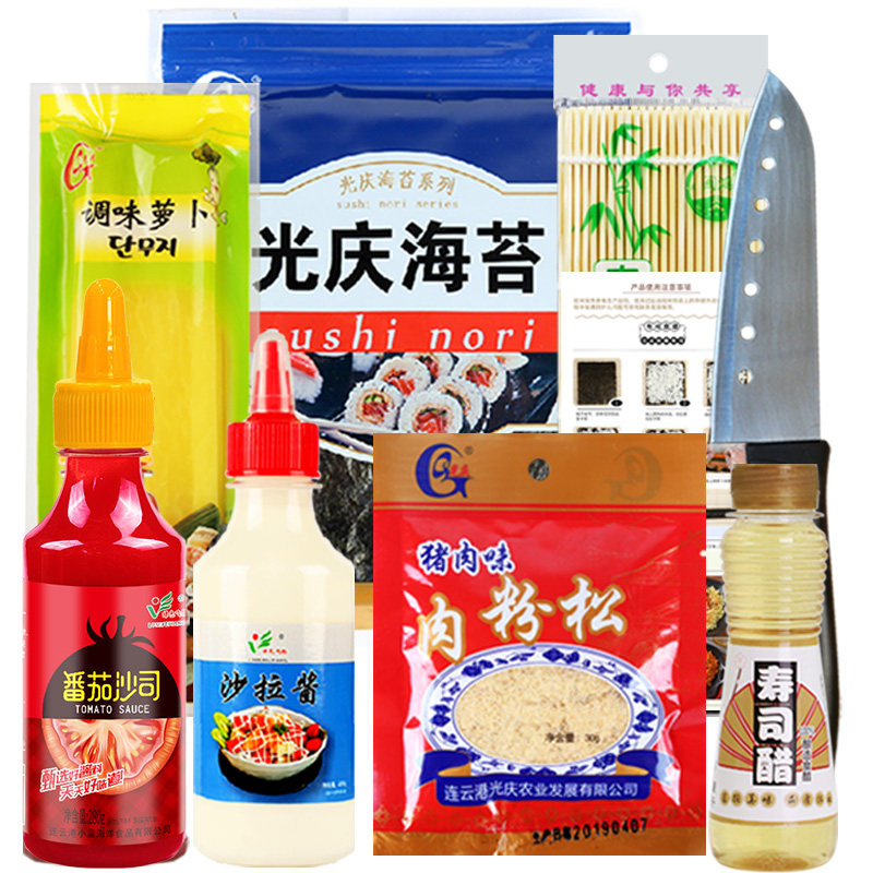 Sushi nori, sushi vinegar, tomato sauce, salad dressing, sushi radish, meat floss, sushi curtain, knife, preparation instructions