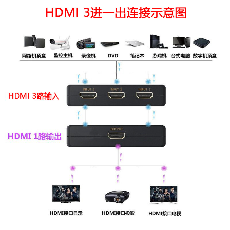HDMI switch 3 in 1 out 4KHDMI allocator HD display computer screen laptop with remote control switch
