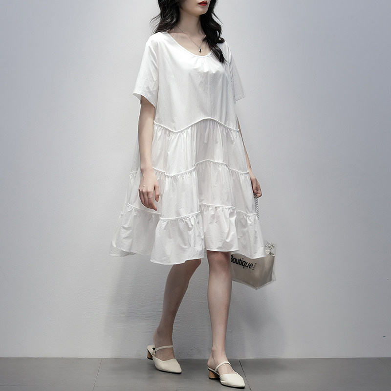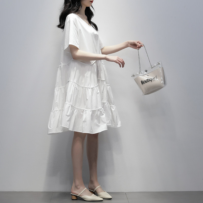 White dress girl 2022 summer new Korean short sleeve collar short - sleeve neck short - sleeve medium - long version a-word skirt
