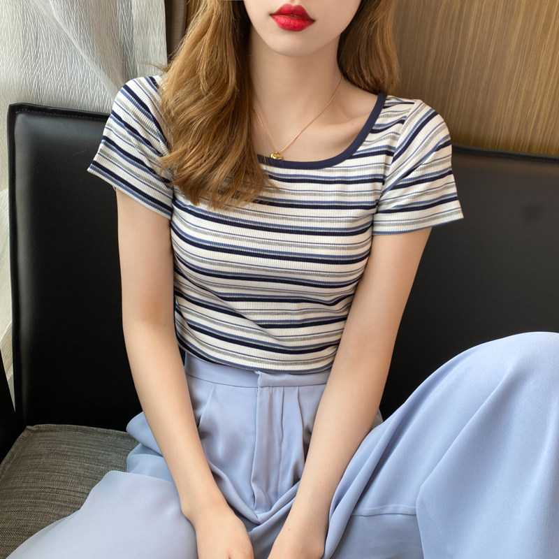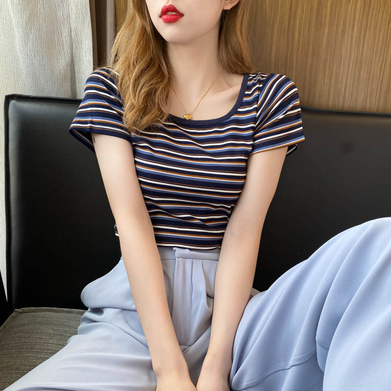 Striped Short Sleeve T-shirt Woman 2022 Summer short Article Body Pure Cotton Ins ultra-fire high waist square collar tight jacket tide