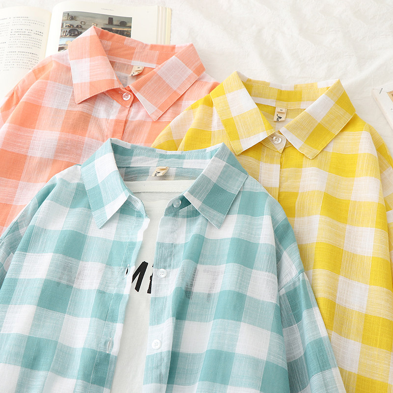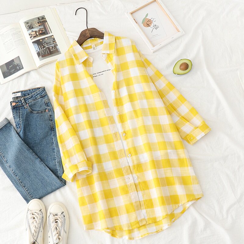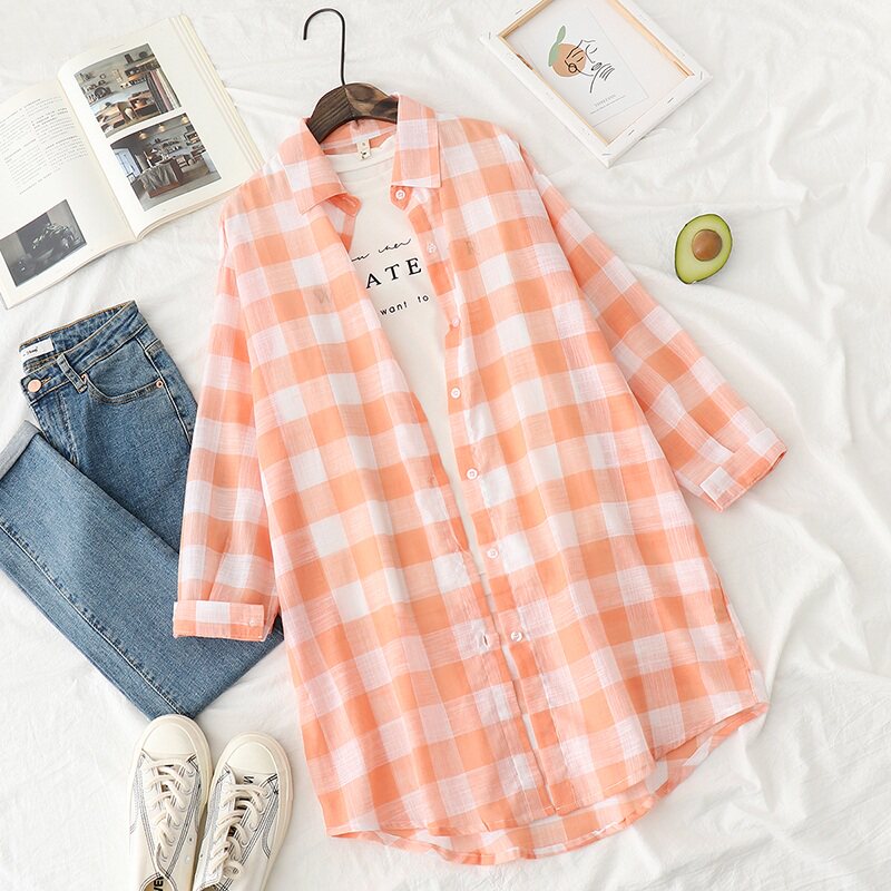 Summer new Korean version Loose Plaid Shirt Woman large size Long sleeves Long version of sunscreen shirt blouses jacket thin jacket