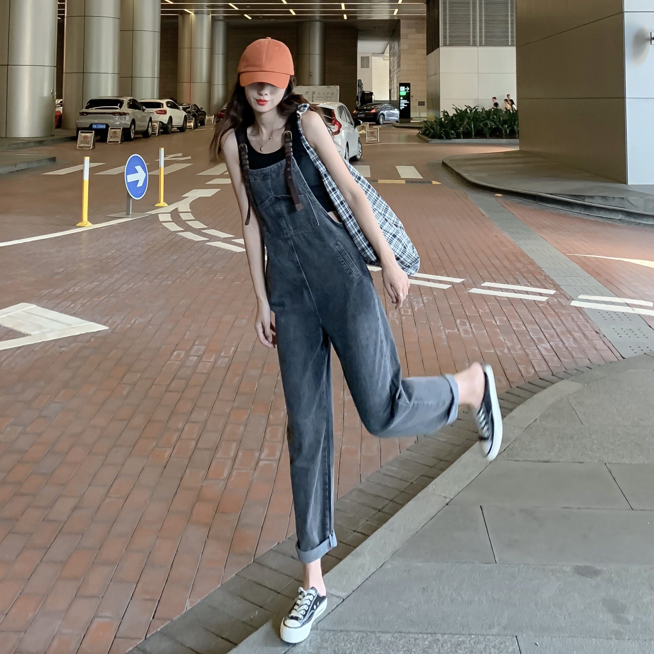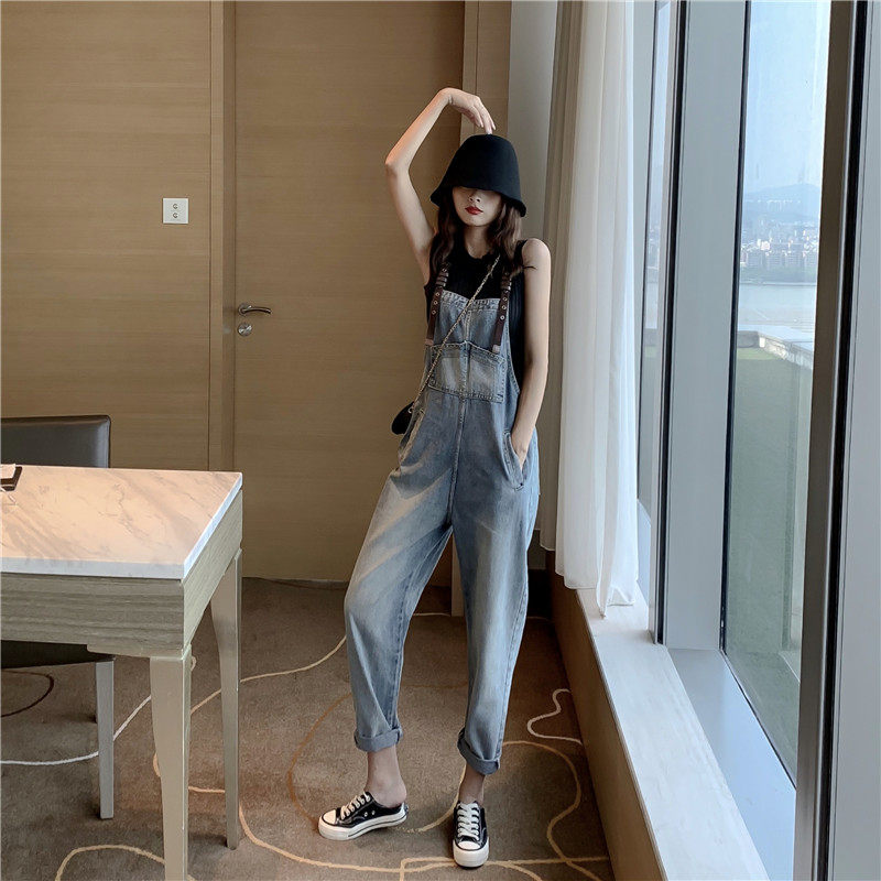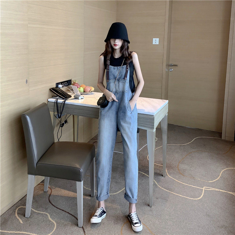 Hyun A wind jeans overalls female 2021 summer age reduction Korean version loose all-match straight nine points pants student tide