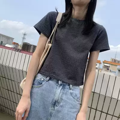 Retro Contrast Striped T-shirt Women Summer Skin-friendly Harbor Wind chic Cotton Short base shirt Short Sleeve Top Women Tide