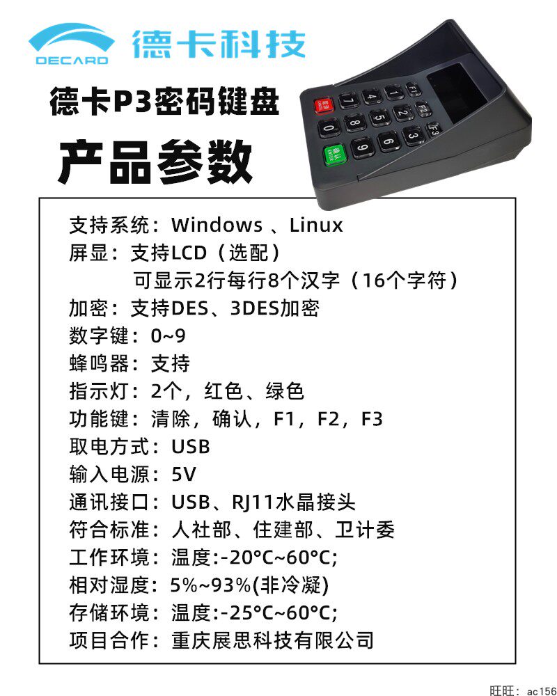 Deka P3—USB interface (without LCD) Deka P3 card reader expansion U port Deka P3——RJ11 interface anti-peep voice password keyboard (1 4 1 8) anti-peep secret
