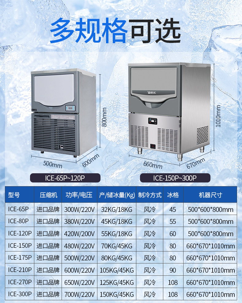 32KG square ice machine (45 ice sheet) 45 KG square ice machine (55 ice sheet) 55 KG square ice machine (60 ice sheets) 70 KG square ice machine (80 ice)
