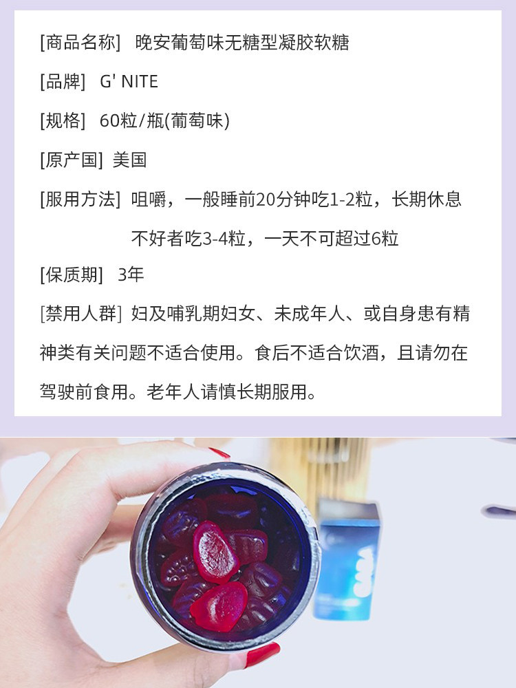 G'nite imported from the United States Gaba sleeping gummy sugar-free aminobutyric acid grape flavor 60 capsules