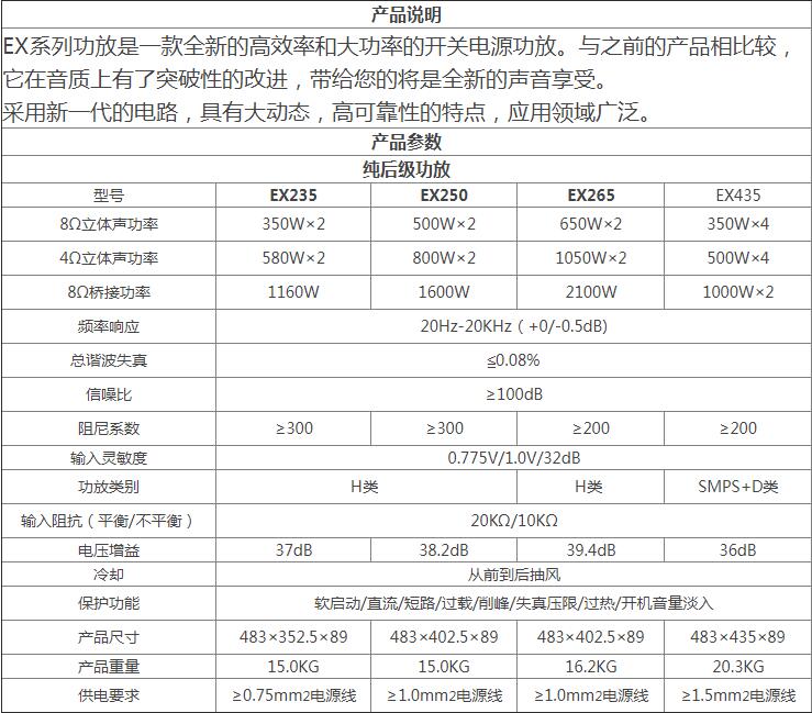 EX235 (2 * 350W) EX250 (2 * 500W) EX265 (2 * 650W) EX435 (4 * 350W)