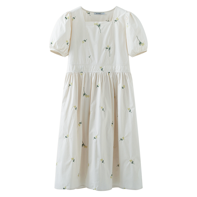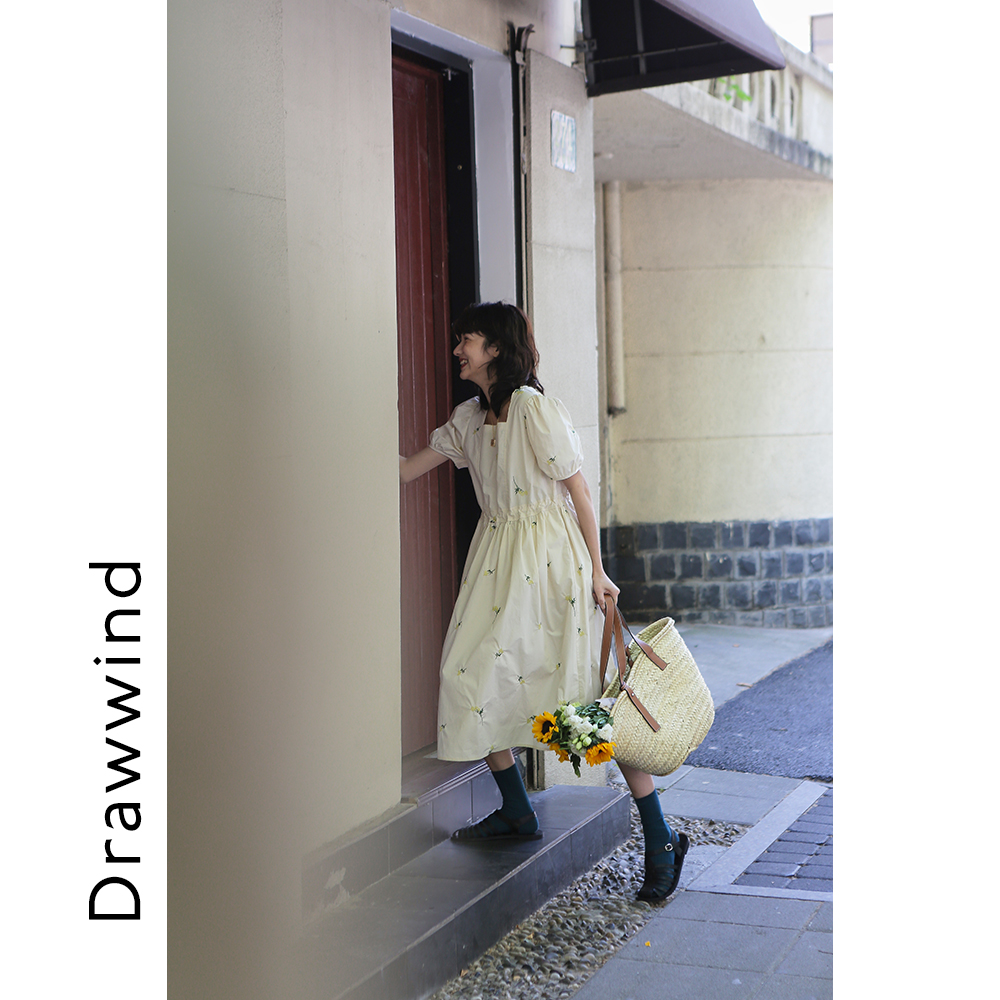style drawwind dress women 2021 new loose square collar embroidery bubble sleeves medium long short-sleeved skirt