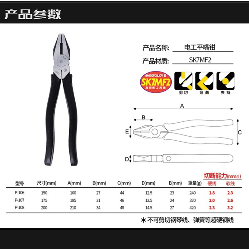 Japanese horse brand tiger pliers wire pliers P-106 107 108 electrician flat pliers wire pliers flat mouth pliers