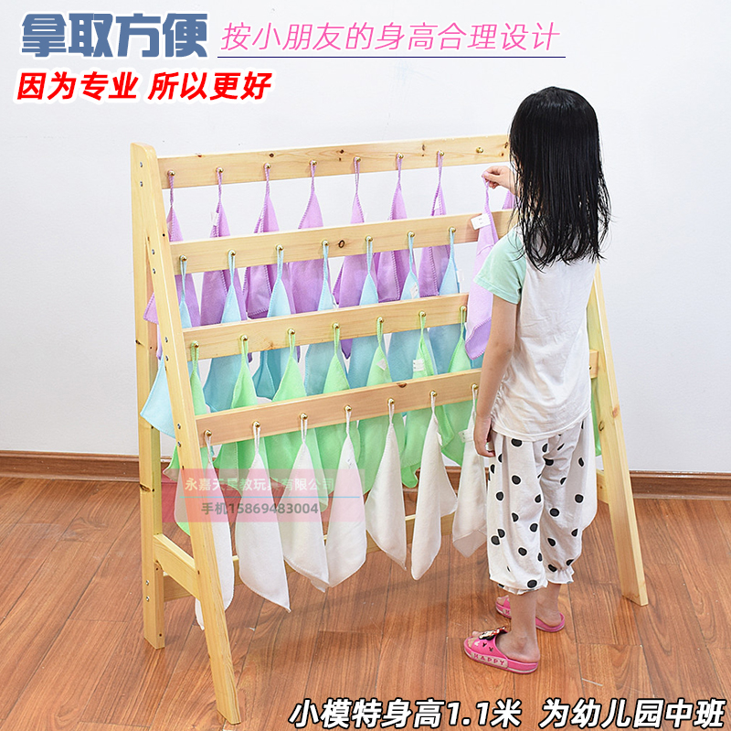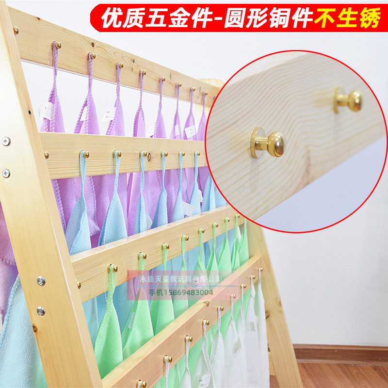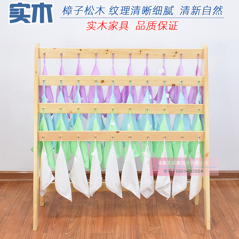 Kindergarten children solid wood wool towel rack baby towel hanging rack containing teaching toy cabinet Zhangzi pine wood leaning against wall