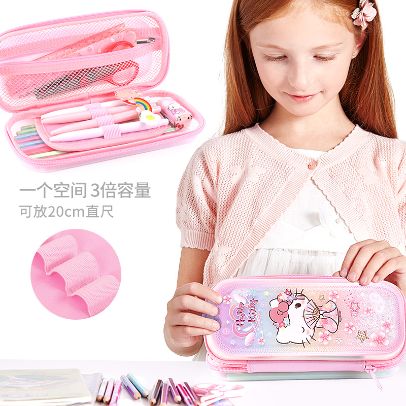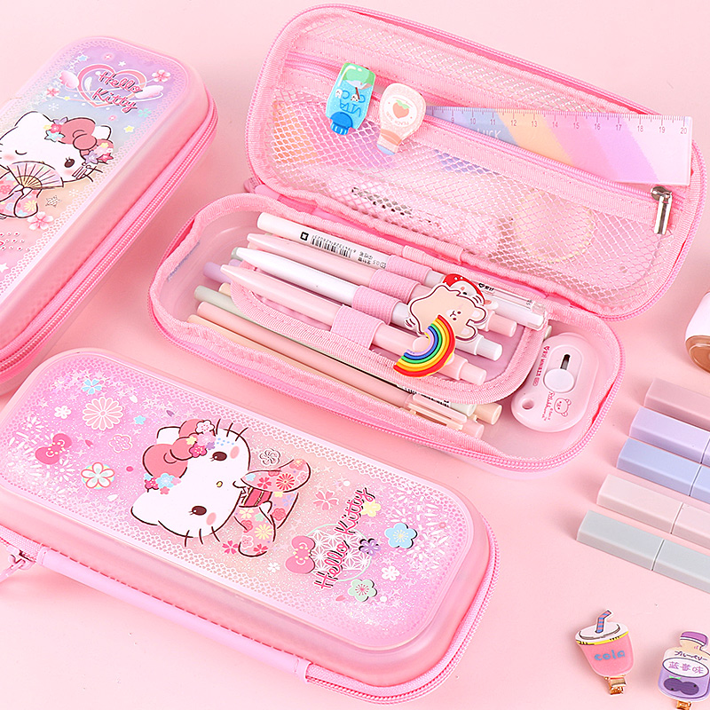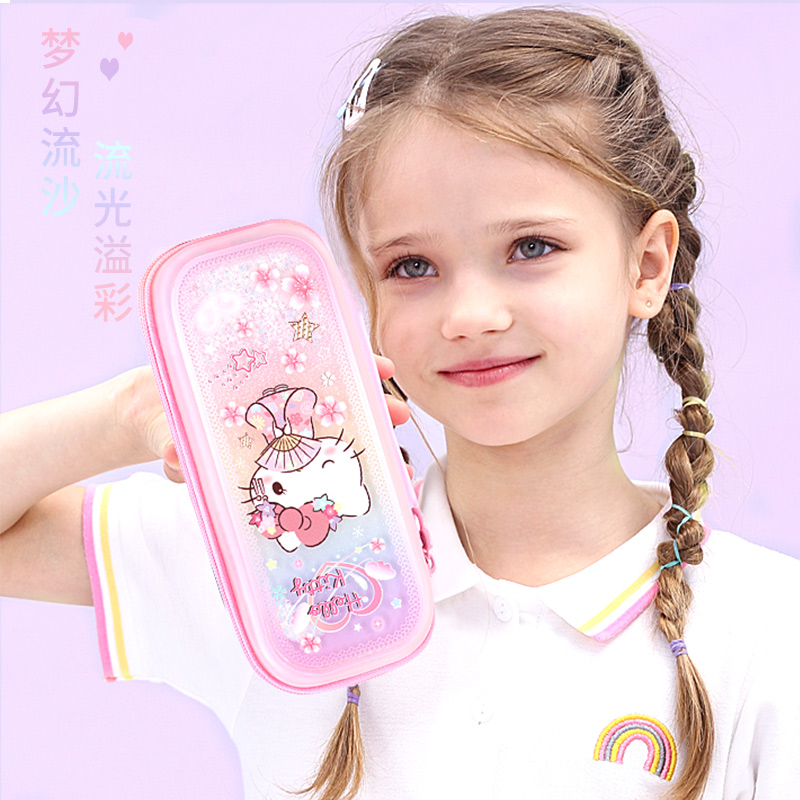 Hello Elementary Students Pen Bag Girl Streaming Sand Cartoon Multifunction Large Capacity Pencil Case Creative Lead Pencil Case Pen Bag