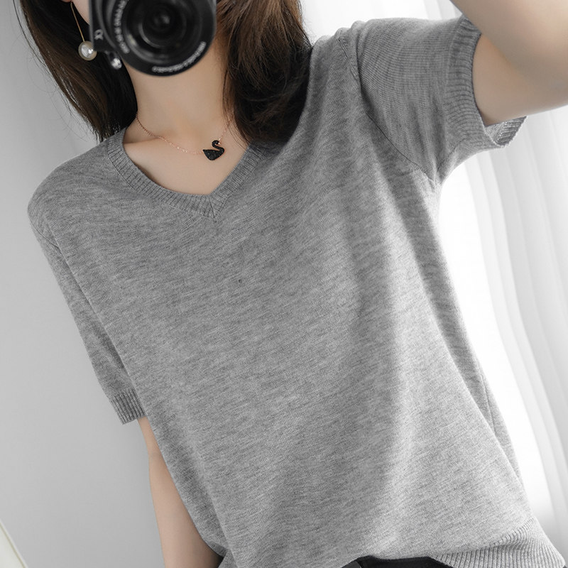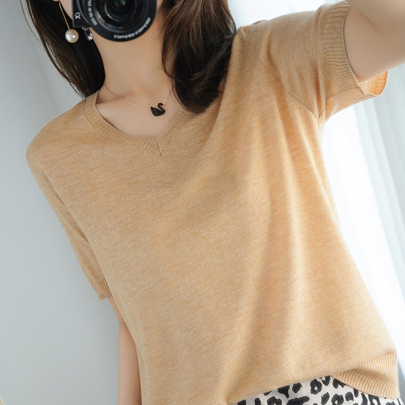 Thin knitted short-sleeved t-shirt women's 2021 summer new V-neck loose short ins tide top V-neck half-sleeve