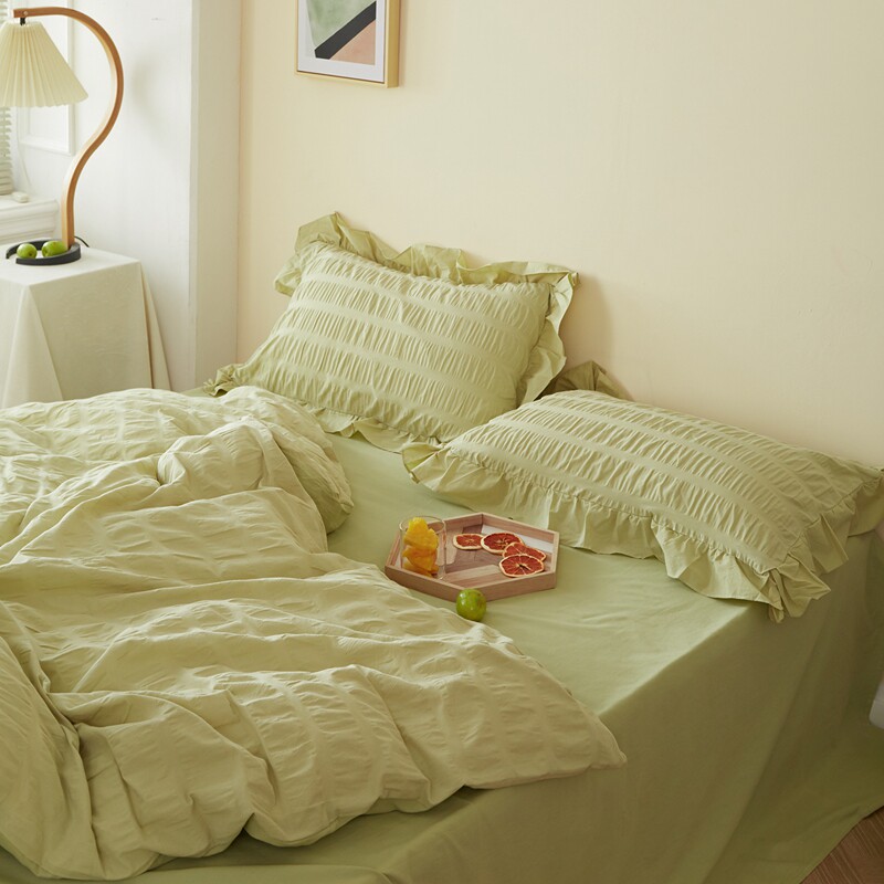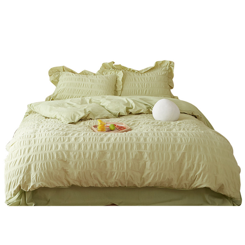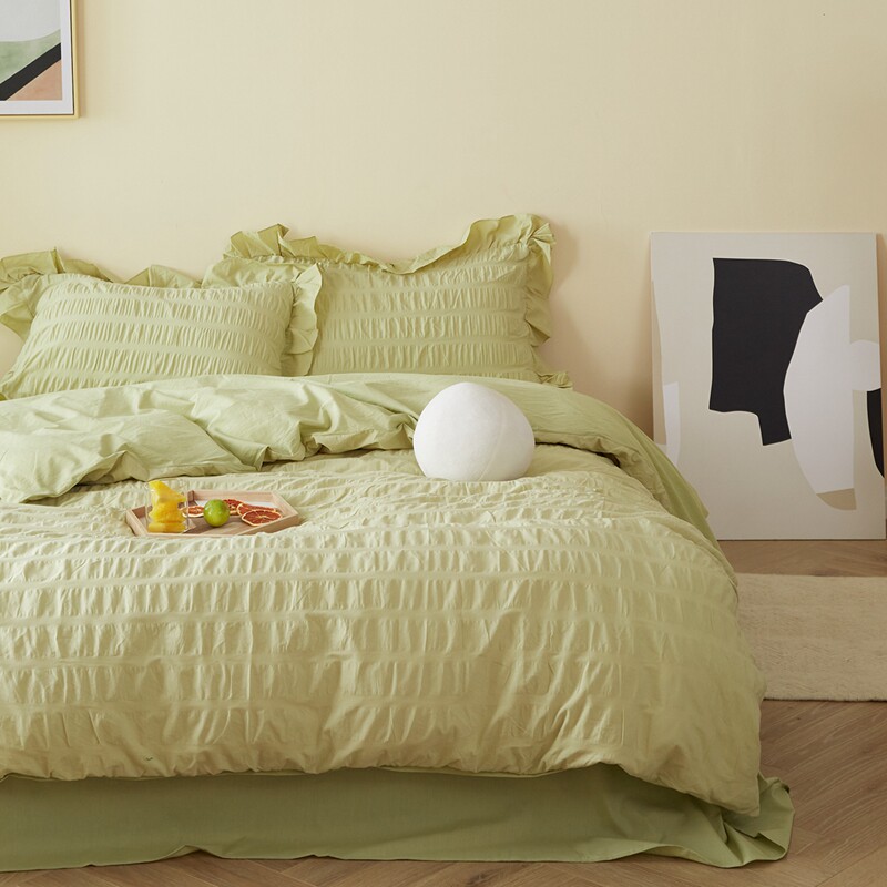 GREEN Mustard Green Bubble Yarn Cotton Four-piece Refreshing Summer Bedding Solid Color Duvet Cover 1 5 Fitted Sheet