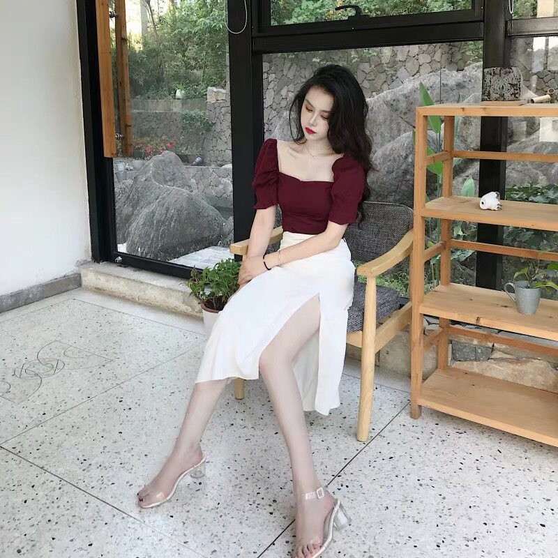 Burgundy top White skirt