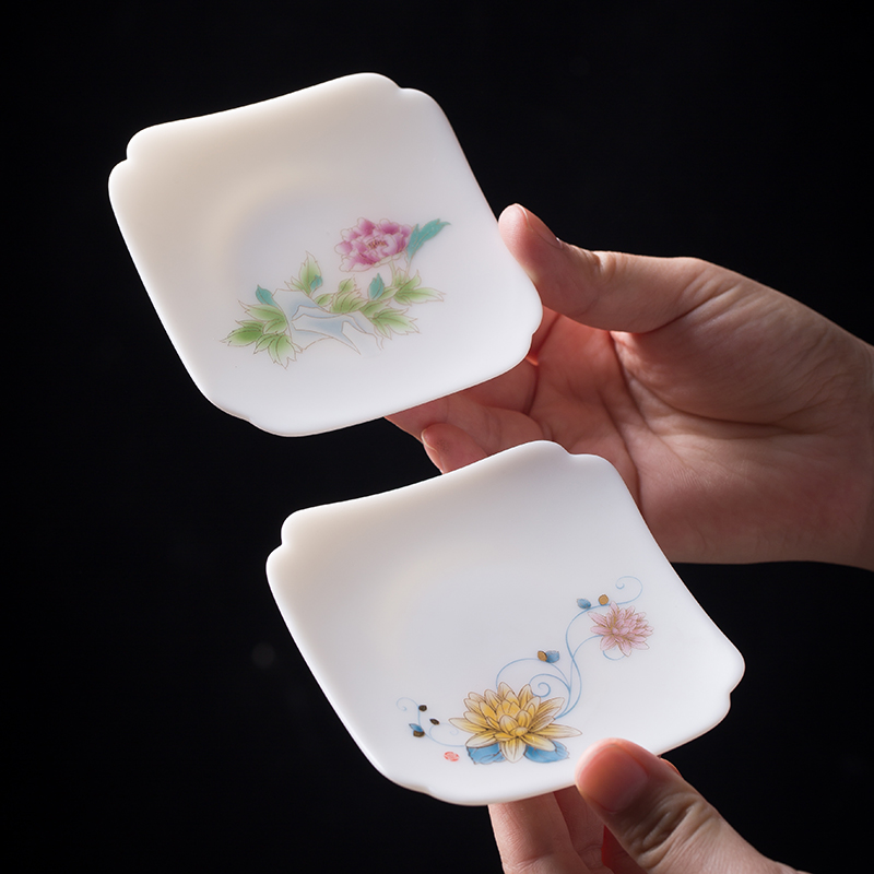 White porcelain suet jade cup cushion square tea cushion hand painted enamel tea cup holder ceramic Kung Fu tea set dry saucer accessories